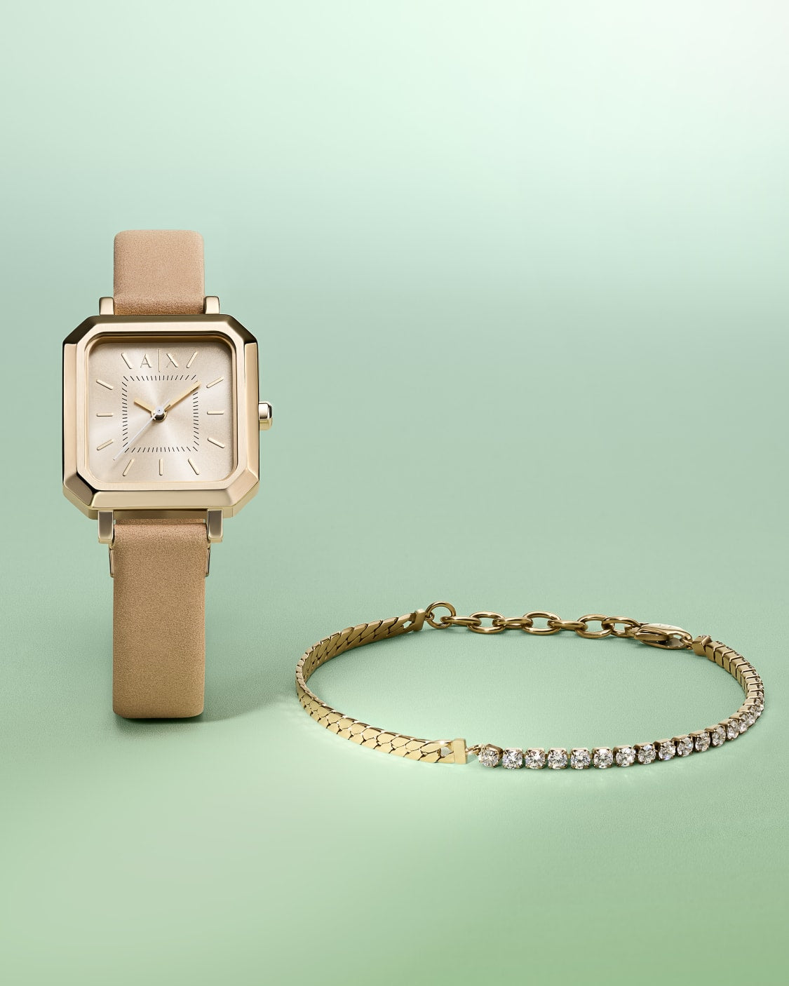 The Armani Exchange Jewellery Watch collection blends the elegance of fine jewellery with the functionality of a timepiece, offering an accessory that is both chic and versatile. Featuring luxurious details like sparkling crystals, polished finishes, and bracelet-inspired designs, these watches are crafted to add a touch of glamour to any look. Perfect for special occasions or elevating everyday style, Armani Exchange Jewelry Watches make a sophisticated statement, showcasing the brand’s commitment to modern luxury and refined aesthetics.