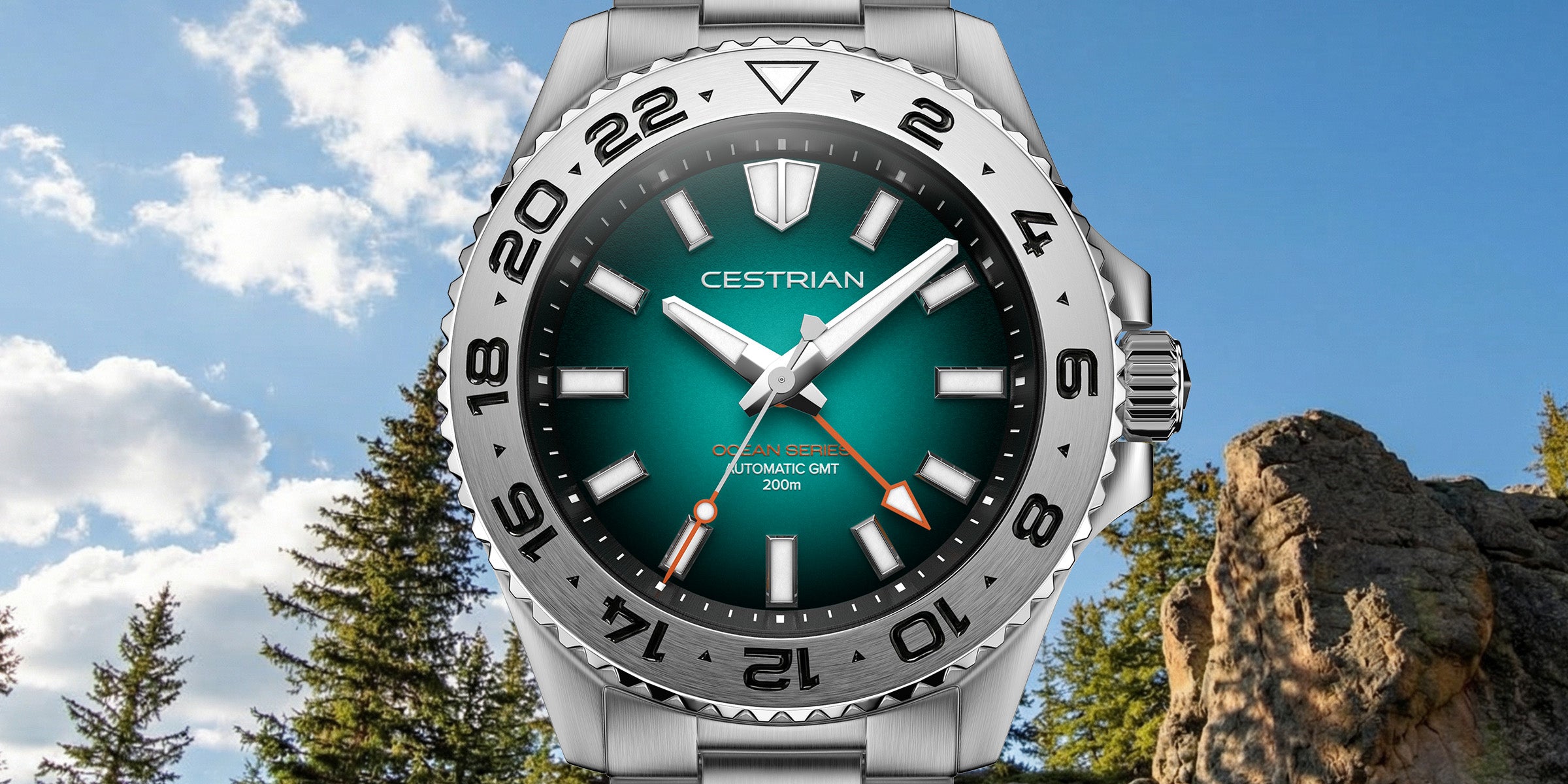 The Ocean Series is a travel-ready GMT that balances functionality with everyday wearability. Powered by a Seiko NH34 automatic GMT movement and protected by sapphire crystal, it offers 200m water resistance and a bi-directional 24-click bezel for tracking a second time zone.