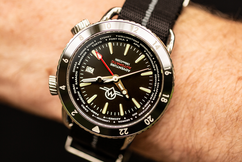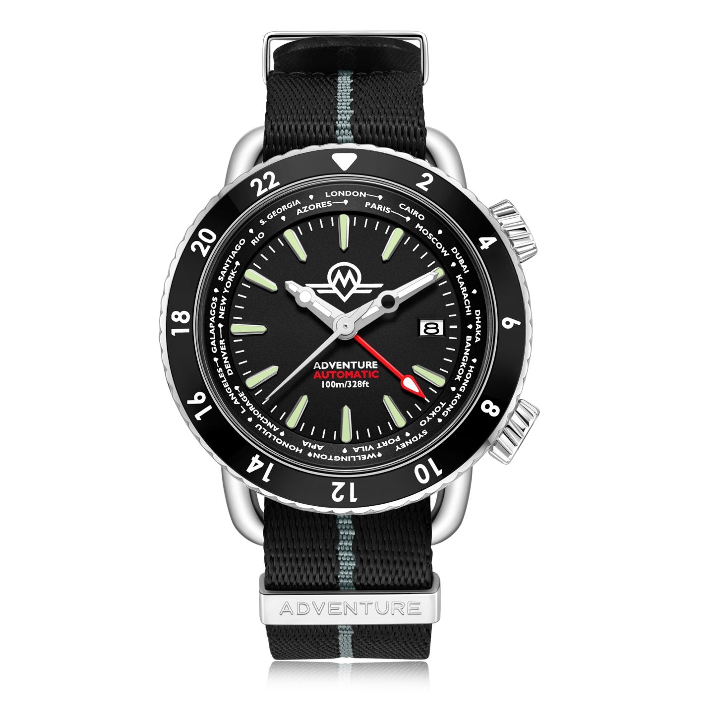 Explore the cityscapes of the world with the MA-1 Urban Black Automatic GMT. In a polished stainless steel case with a black dial and vivid red features, a ceramic 120-click diver's bezel, dual luminosity, 100m water resistance and a rotating world city ring to give you 24 time zones on your wrist. Presented in its passport box with a bespoke black rubber military style strap and a robust black & grey nylon strap. Limited editions of 500 worldwide with a 2 year international warranty, where will time take you?