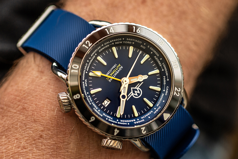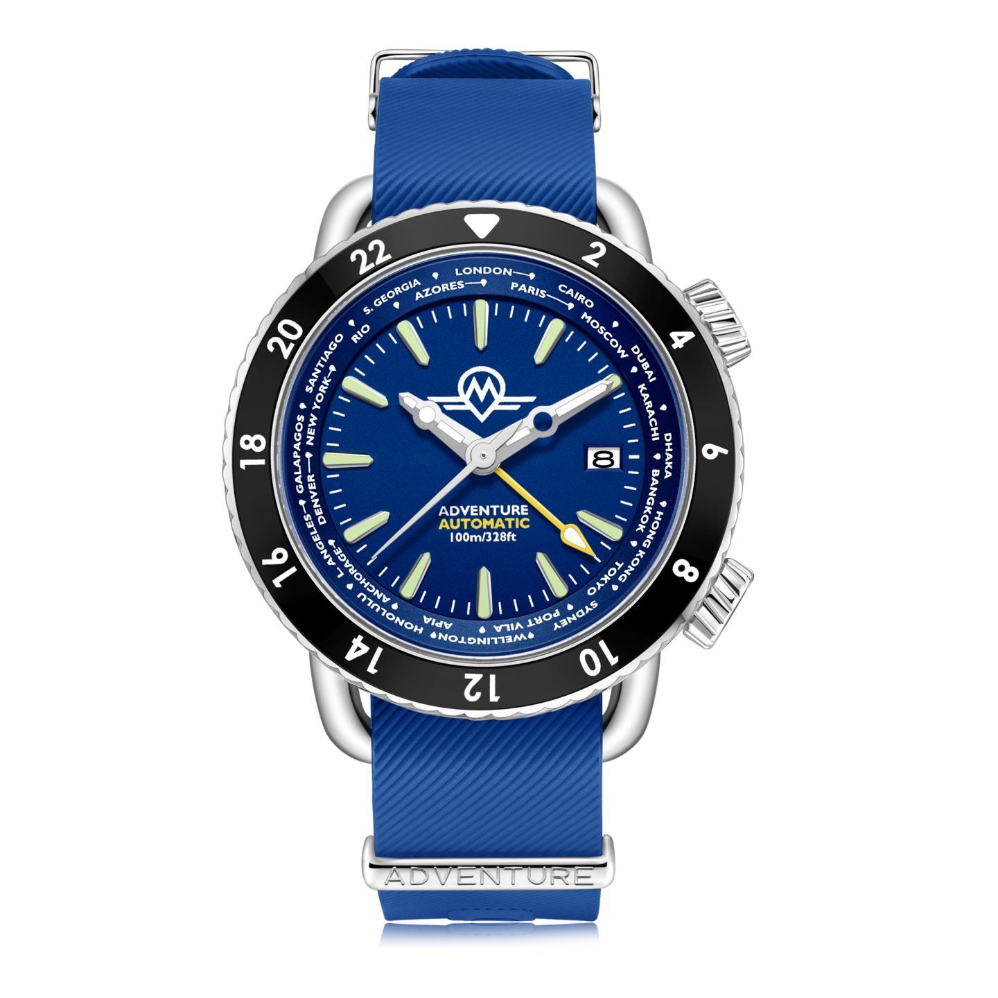 Dive into the seas of the world with the MA-2 Deep Sea Blue Automatic GMT. In a polished stainless steel case with a blue dial and striking yellow features, a ceramic 120-click diver's bezel, dual luminosity, 100m water resistance and a rotating world city ring to give you 24 time zones on your wrist. Presented in its passport box with a bespoke blue rubber military style strap and a robust black & grey nylon strap. Limited edition of 500 worldwide, where will time take you?