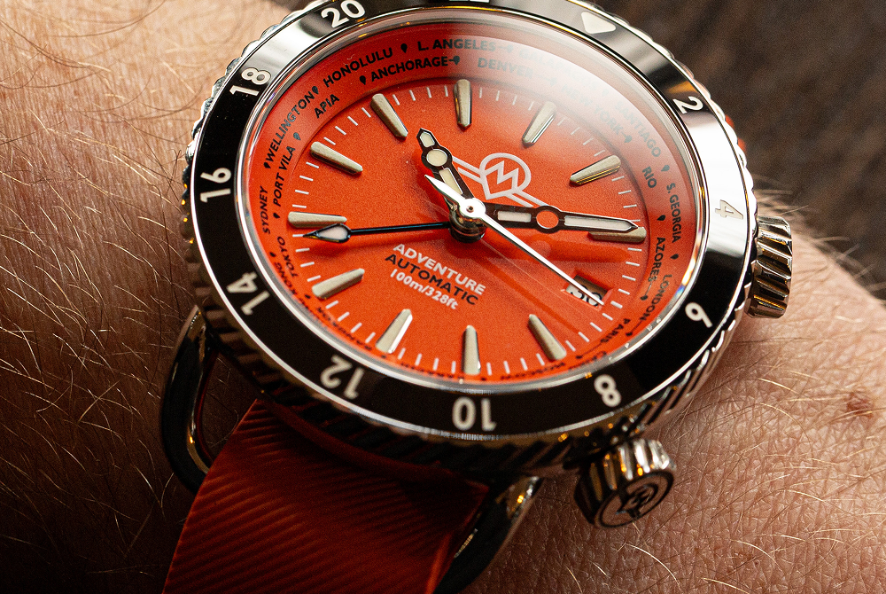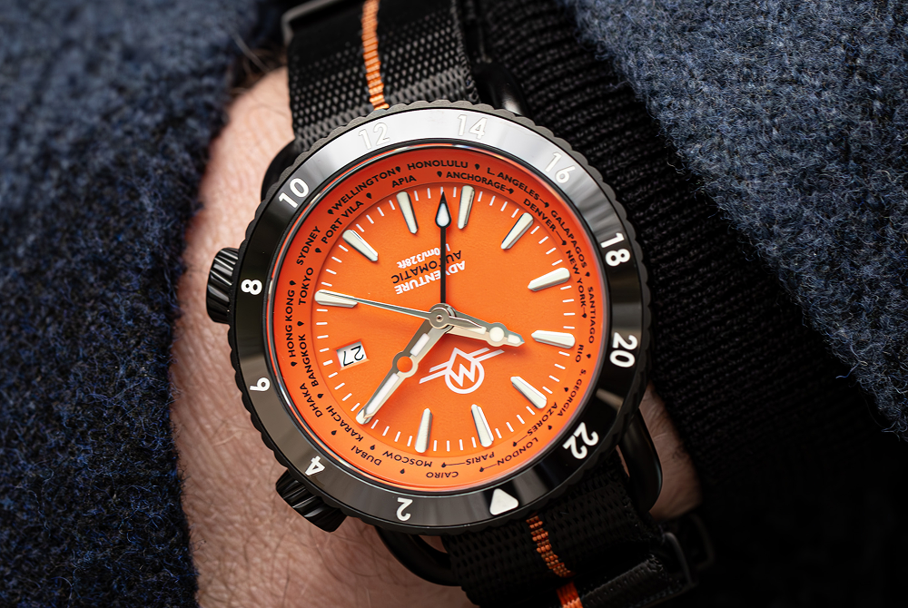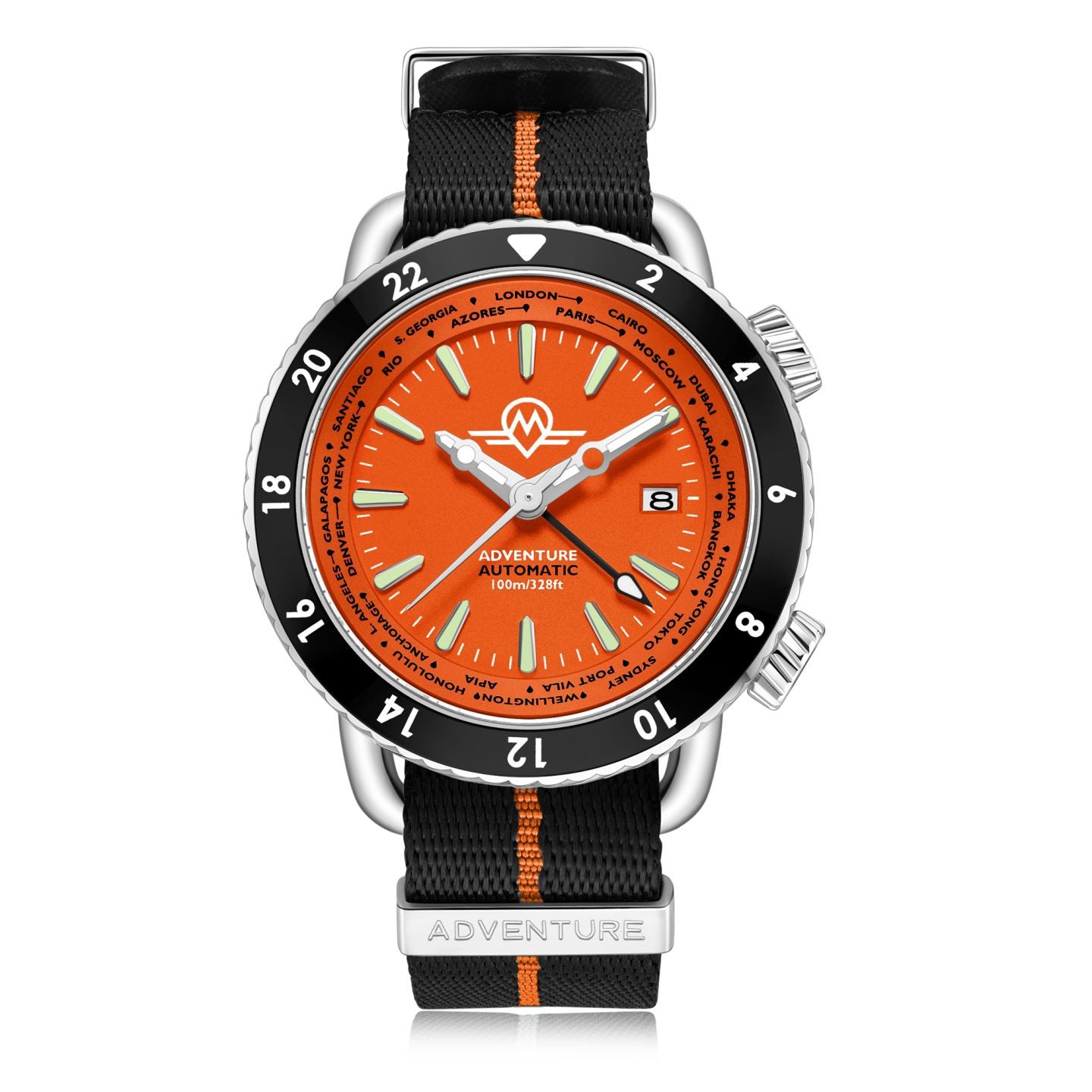 Enjoy the beaches of the world with the MA-3 Sunset Orange Automatic GMT. In a polished stainless steel case with an orange dial and black features, a ceramic 120-click diver's bezel, dual luminosity, 100m water resistance and a rotating world city ring to give you 24 time zones on your wrist. Presented in its passport box with a bespoke orange rubber military style strap and a robust black & orange nylon strap. Limited editions of 500 worldwide with a 2 year international warranty, where will time take you?