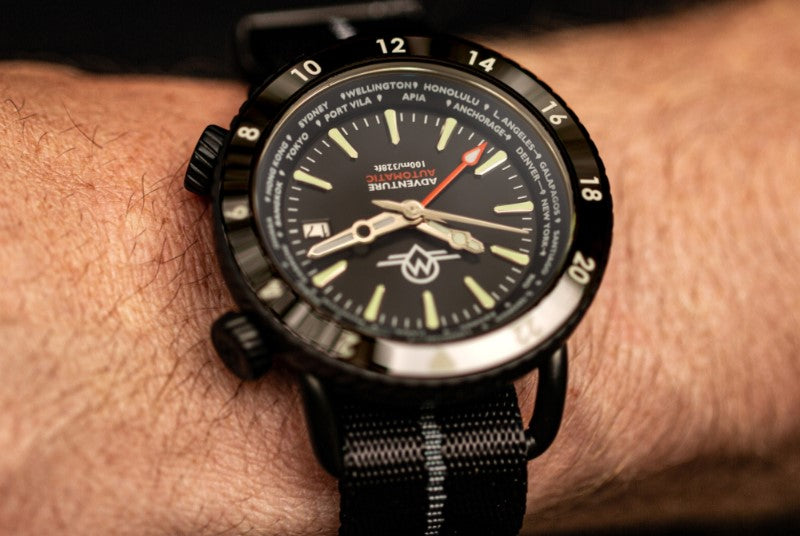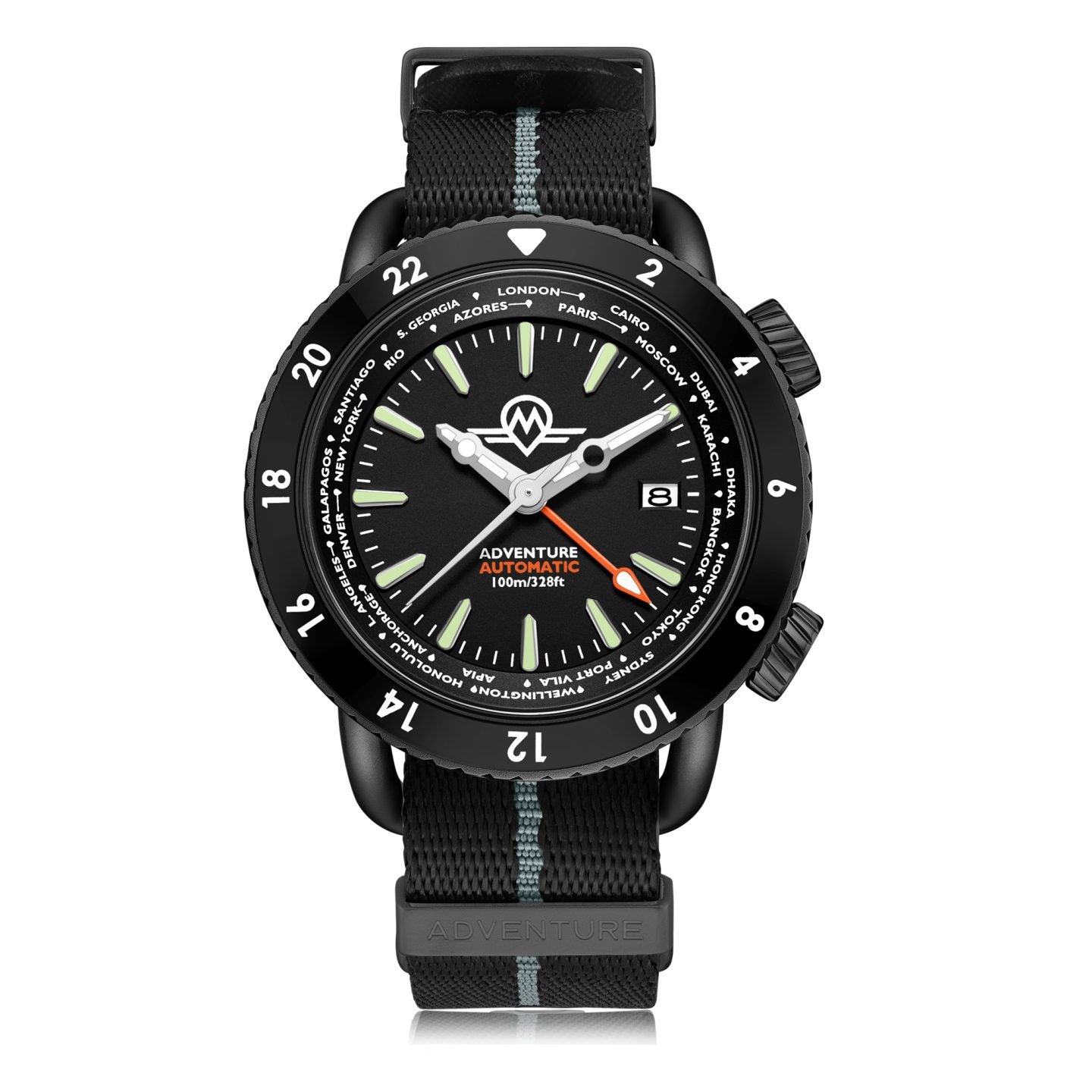 Immerse yourself in the darkest corners of the world with the MA-5 Urban Black X Automatic GMT. In a black PVD, sand blasted stainless steel case with black dial and striking orange features, a ceramic 120-click diver's bezel, dual luminosity, 100m water resistance and a rotating world city ring to give you 24 time zones on your wrist. Presented in its passport box with a bespoke black rubber military style strap and a robust black & grey nylon strap. Limited editions of 500 worldwide with a 2 year international warranty, where will time take you?
