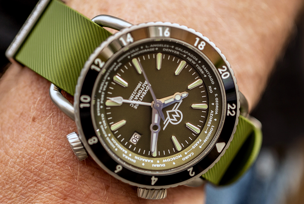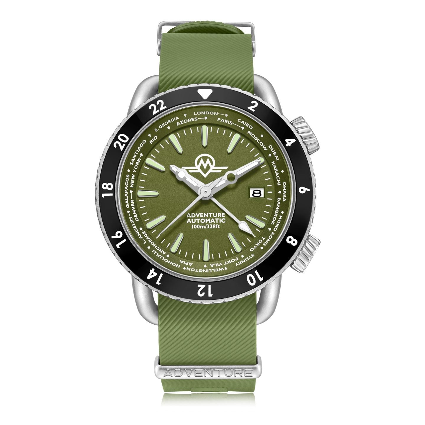 Adventure across the world with the MA-4 Woodland Green Automatic GMT. In a sand blasted stainless steel case with a green dial and white features, a ceramic 120-click diver's bezel, dual luminosity, 100m water resistance and a rotating world city ring to give you 24 time zones on your wrist. Presented in its passport box with a bespoke green rubber military style strap and a robust black & grey nylon strap. Limited editions of 500 worldwide with a 2 year international warranty, where will time take you?