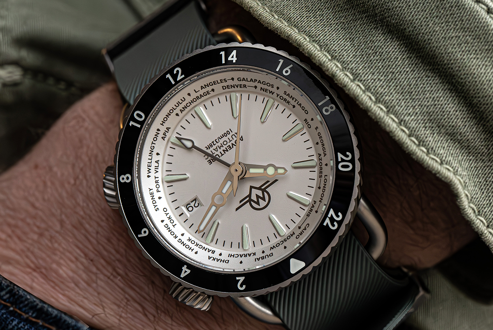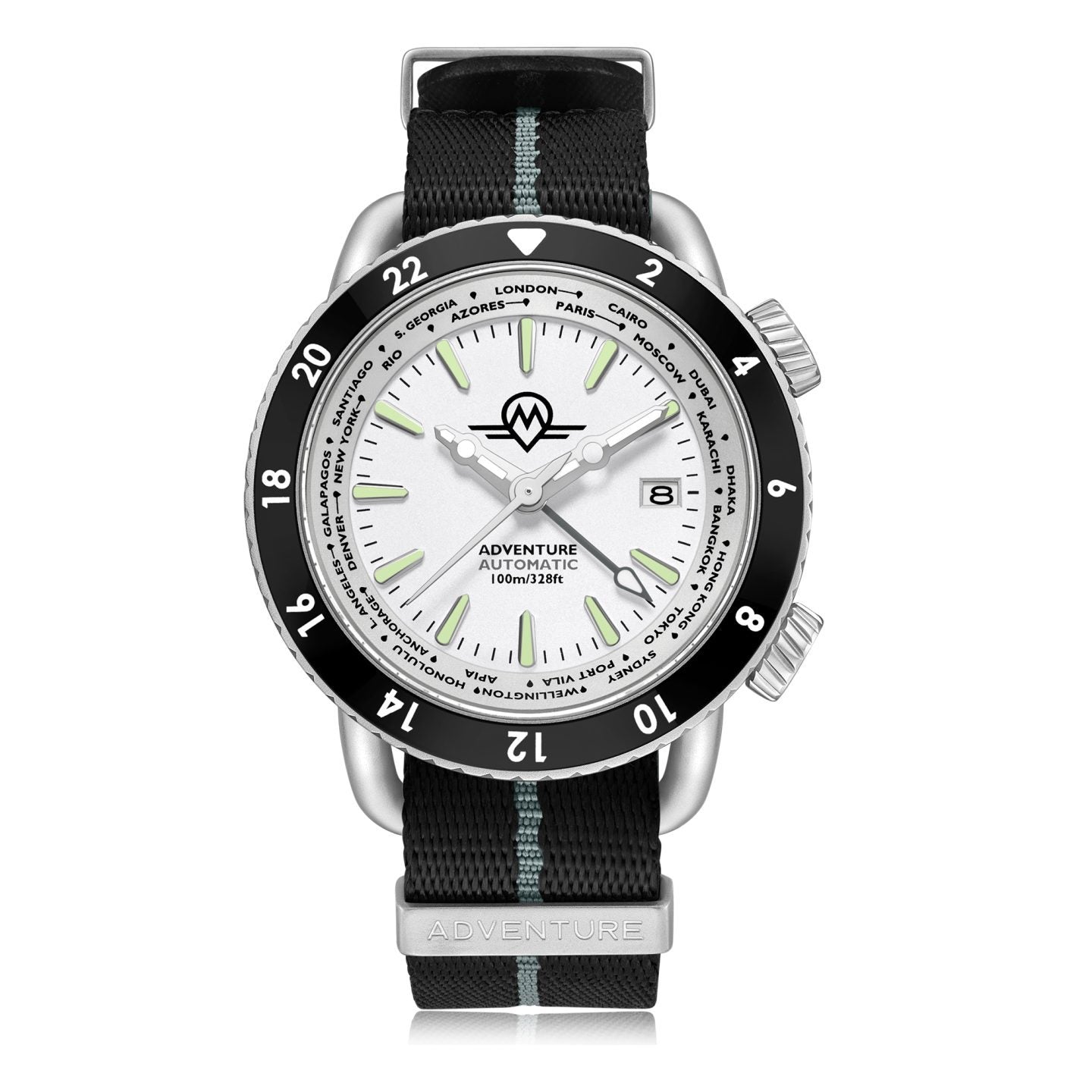 Traverse the snow capped peaks of the world with the MA-6 Arctic White Automatic GMT. In a sand blasted stainless steel case with a white dial and grey features, a ceramic 120-click diver's bezel, dual luminosity, 100m water resistance and a rotating world city ring to give you 24 time zones on your wrist. Presented in its passport box with a bespoke grey rubber military style strap and a robust black & grey nylon strap. Limited editions of 500 worldwide with a 2 year international warranty, where will time take you?