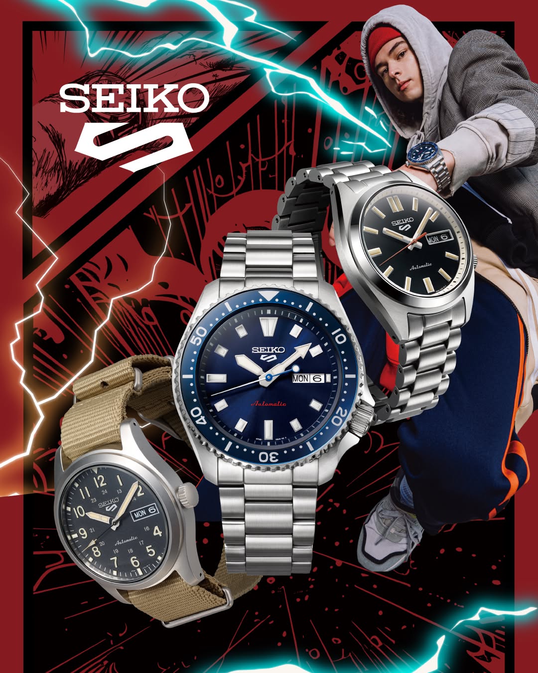 The Seiko 5 family has set the standard in affordable, rugged and stylish watches since 1963. They incorporate simplicity, but seriousness. The name of the Seiko 5 derives from its five key attributes, which Seiko promised to include in every watch that belonged to the family. They are: automatic winding, displaying the day and date in a single window, water resistance, a recessed crown at the 4 o’clock position and a durable metal bracelet.