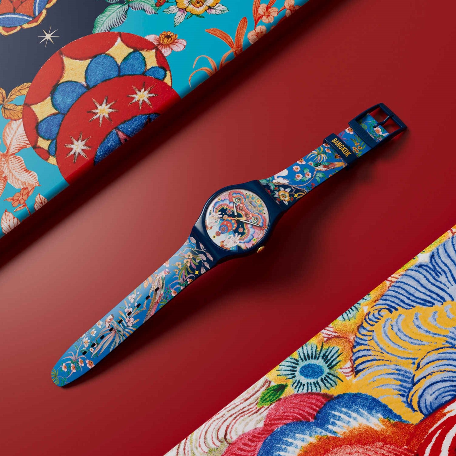 Swatch’s The Wanderer flaunts vibrant storytelling and cultural heritage in one striking timepiece. Created by Bangkok artist Phannapast, its design draws from the tradition of protective amulets, centering on Hanuman as a symbol of loyalty and guardianship, surrounded by celestial motifs from the traditional Prajam Yam pattern.