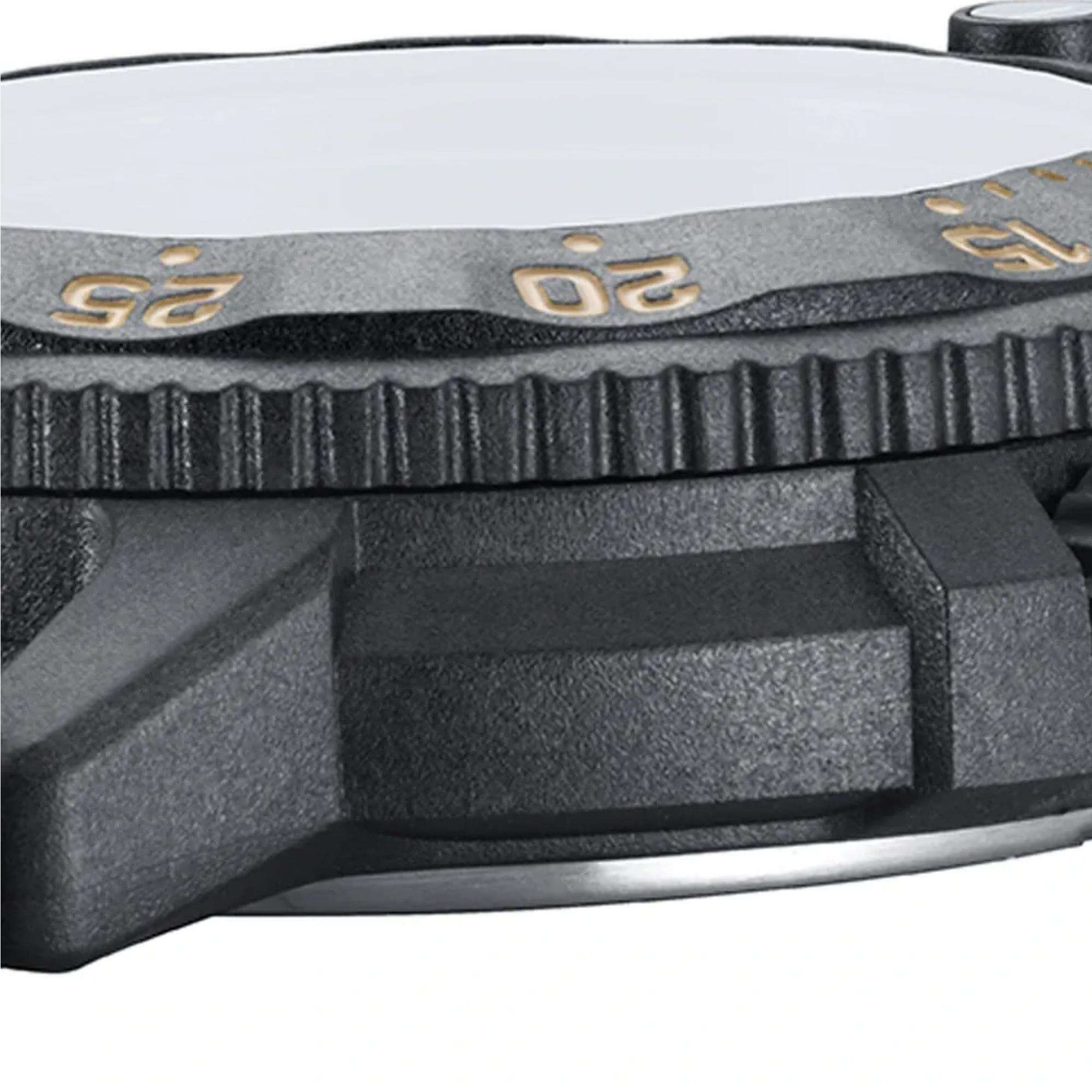 On top of the case there is a black unidirectional rotating bezel with sandy accents that displays a 60-minute scale with increments of 5-minutes. It also displays one of Luminox’s signature LLT (Luminox Light Technology) which are the luminescent pips that are powered by tritium gas which is located at 12 o’clock. At the side of the case at 3 o’clock there is a steel screw down crown that is protected by a sharp angular crown guard. It also features ultra-scratch resistant sapphire crystal that provides the watch with optimum protection. It has been treated to an anti-reflective coating, which ensures that the dial always remains readable.