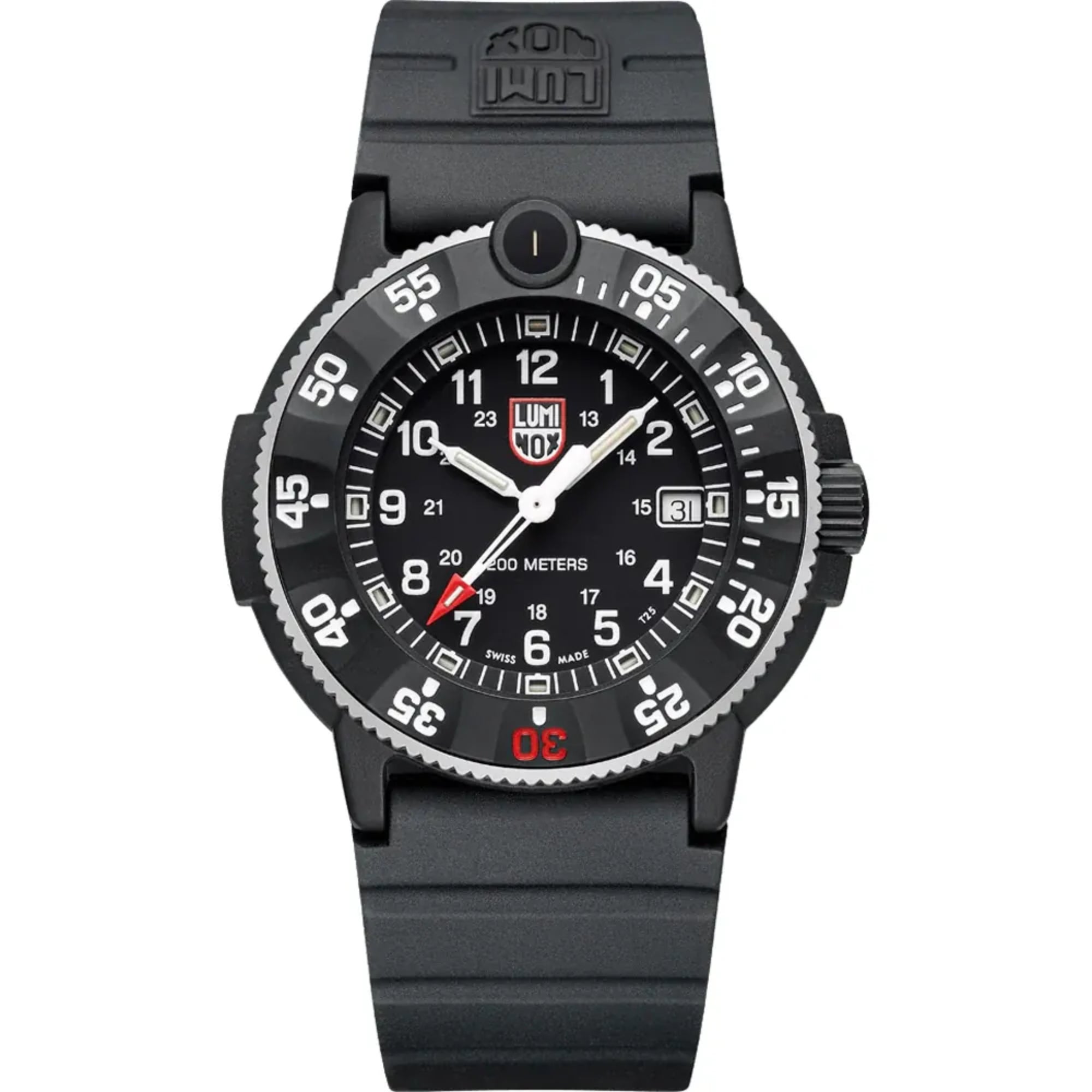 On top of the case there is a bezel that displays a 60-minute scale with increments of 5-minutes. It also displays one of Luminox’s signature LLT (Luminox Light Technology) which is a tritium gas tube that ensures that the watch always remains readable, because the tubes glow constantly 24/7 for up to 25 years. The bezel also displays a diver countdown scale, which is presented in orange for the first 20-minutes. At the side of the case at 3 o’clock there is a steel screw down crown that is protected by a sharp angular crown guard. It also features ultra-scratch resistant sapphire crystal that provides the watch with optimum protection. It has been treated to an anti-reflective coating, which ensures that the dial always remains readable.