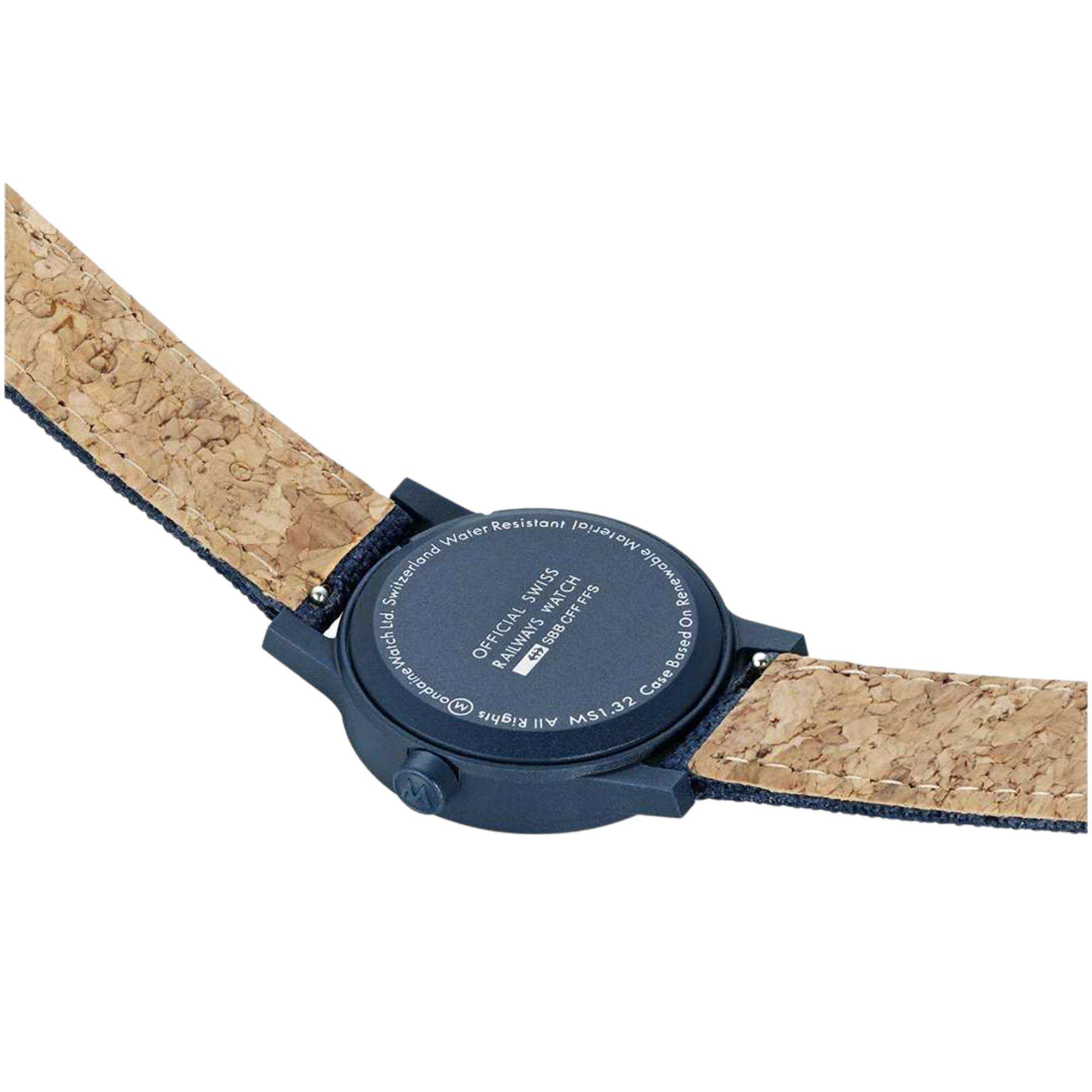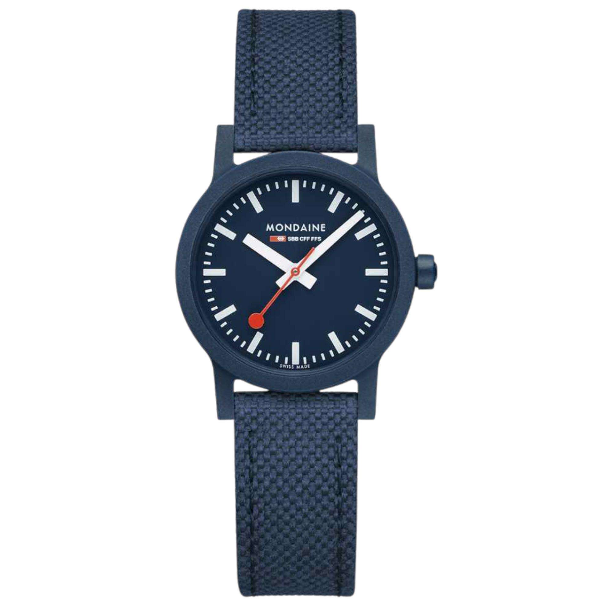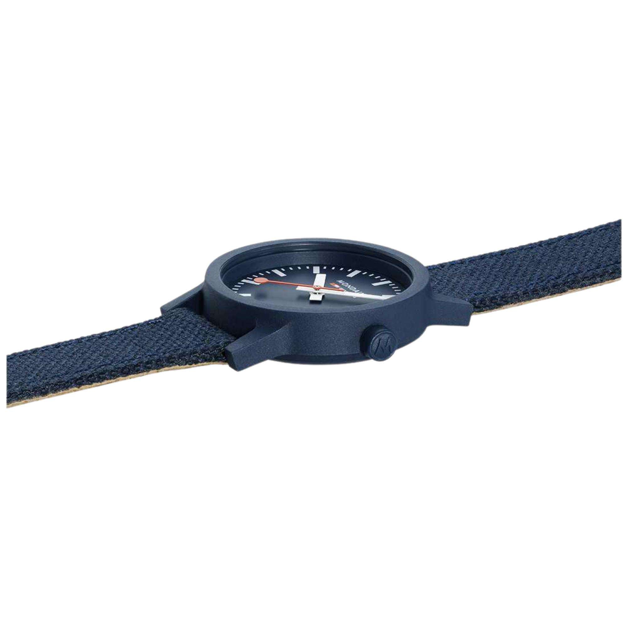 Mondaine Essence Watch MS1.32140.LD Blue Recycled Textile Strap features a 32mm deep ocean blue case that is crafted from a bio based polyamide. A blue gasket crown is present on the edge of the case, besides the 3 o’clock marker. It has been embossed with a Mondaine logo, which incorporates the brand's iconic design. It also features a fixed bezel and short straight lugs. Hardened mineral crystal glass sits on top of the case, which is a material renowned for its durability.