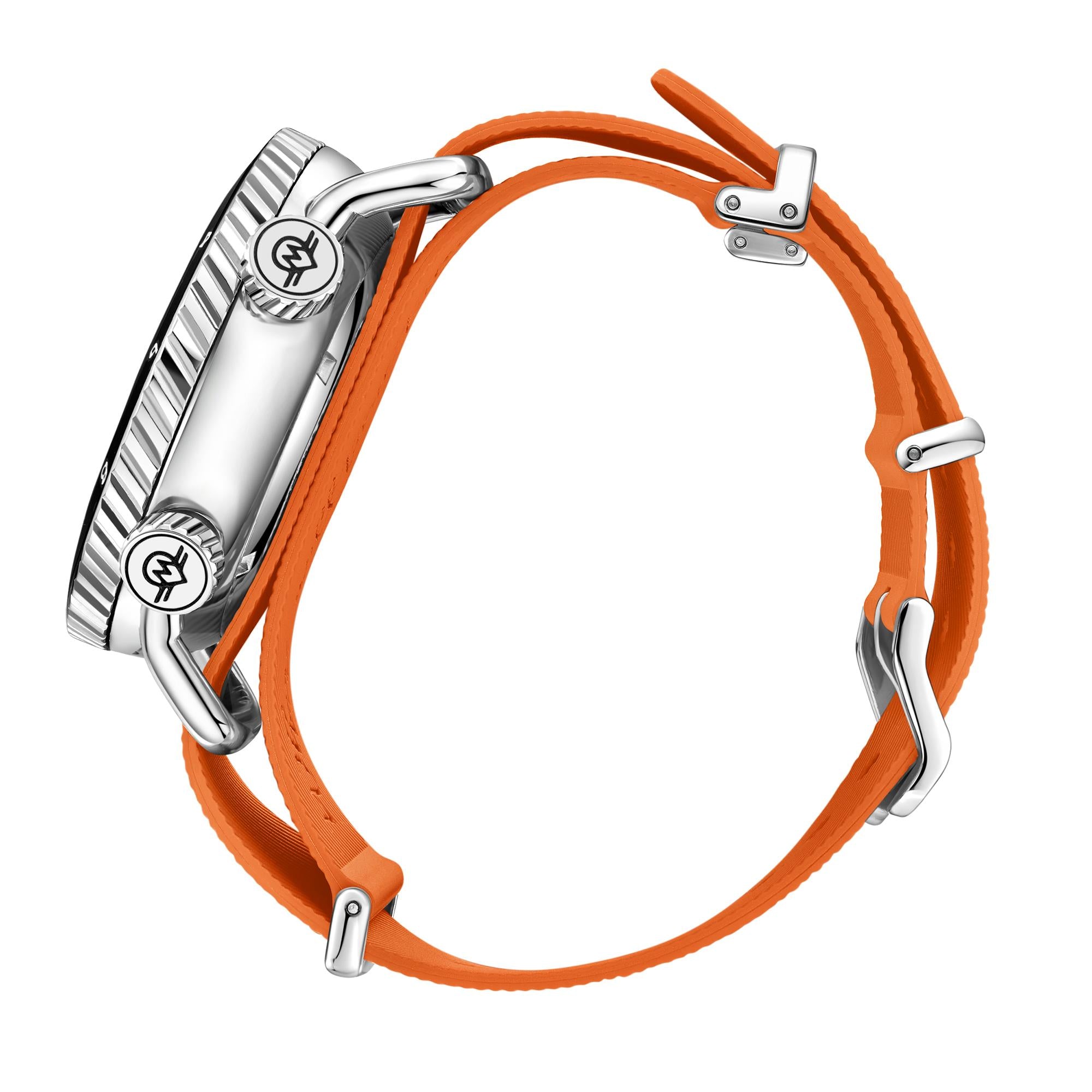 - Black and orange nylon strap for a military-inspired look and comfortable wear.