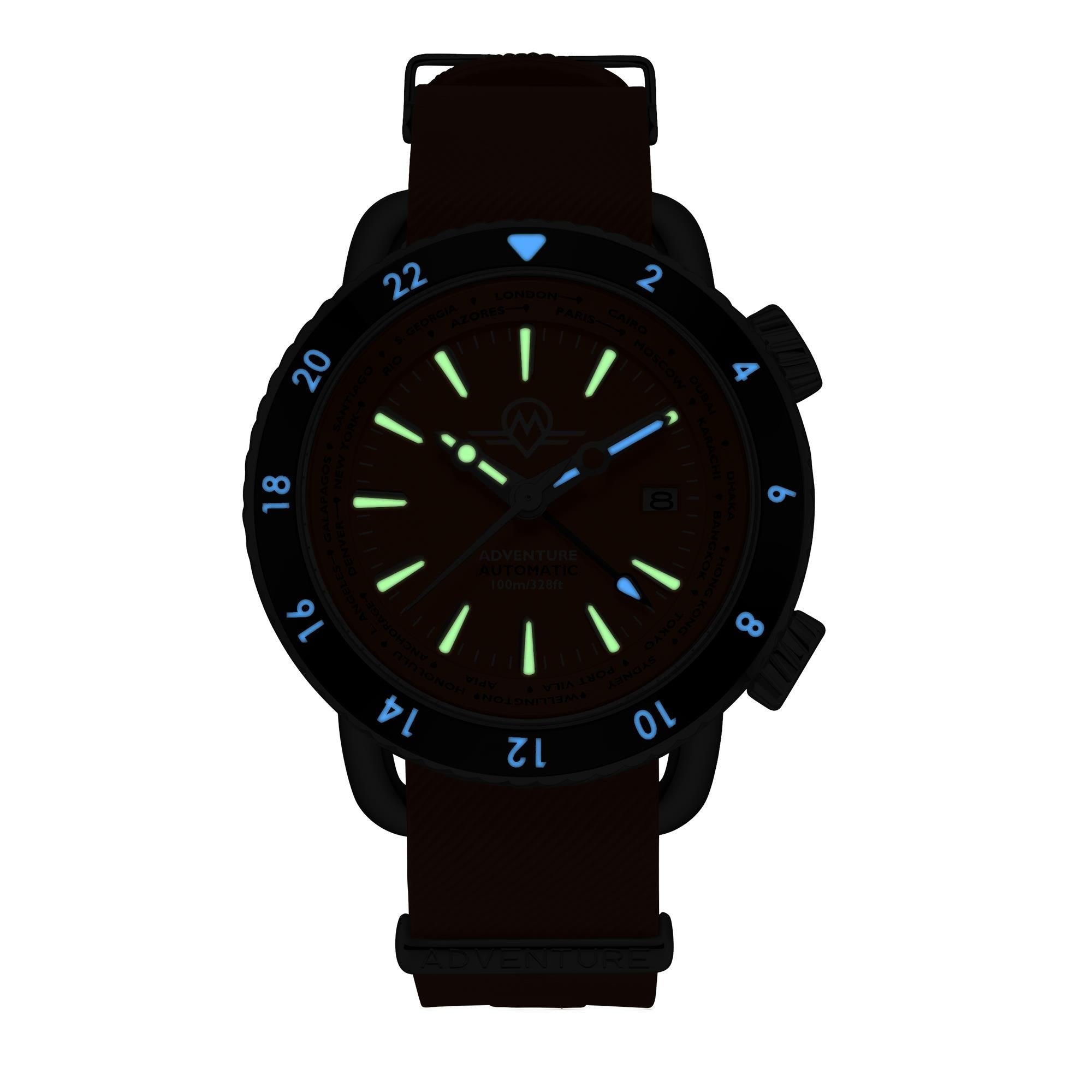 - Black GMT hand with blue luminous paint for tracking a second time zone seamlessly.