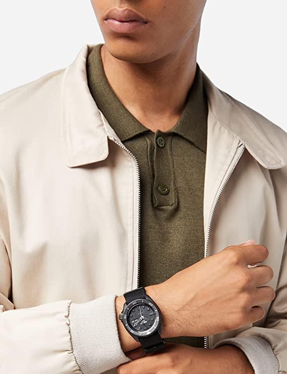 The dial is protected by a thick stainless steel case as well as hardlex crystal glass to provide the protection it deserves. Also, a black bezel sits on-top of the case in increments of ten. The crown can be found at the 4 o'clock position with a raised shield to prevent it being knocked out of place. On the flip side is a open case back which allows you to see all the features and intricate workings of the watch. Then a black canvas strap can be fastened using a standard buckle.