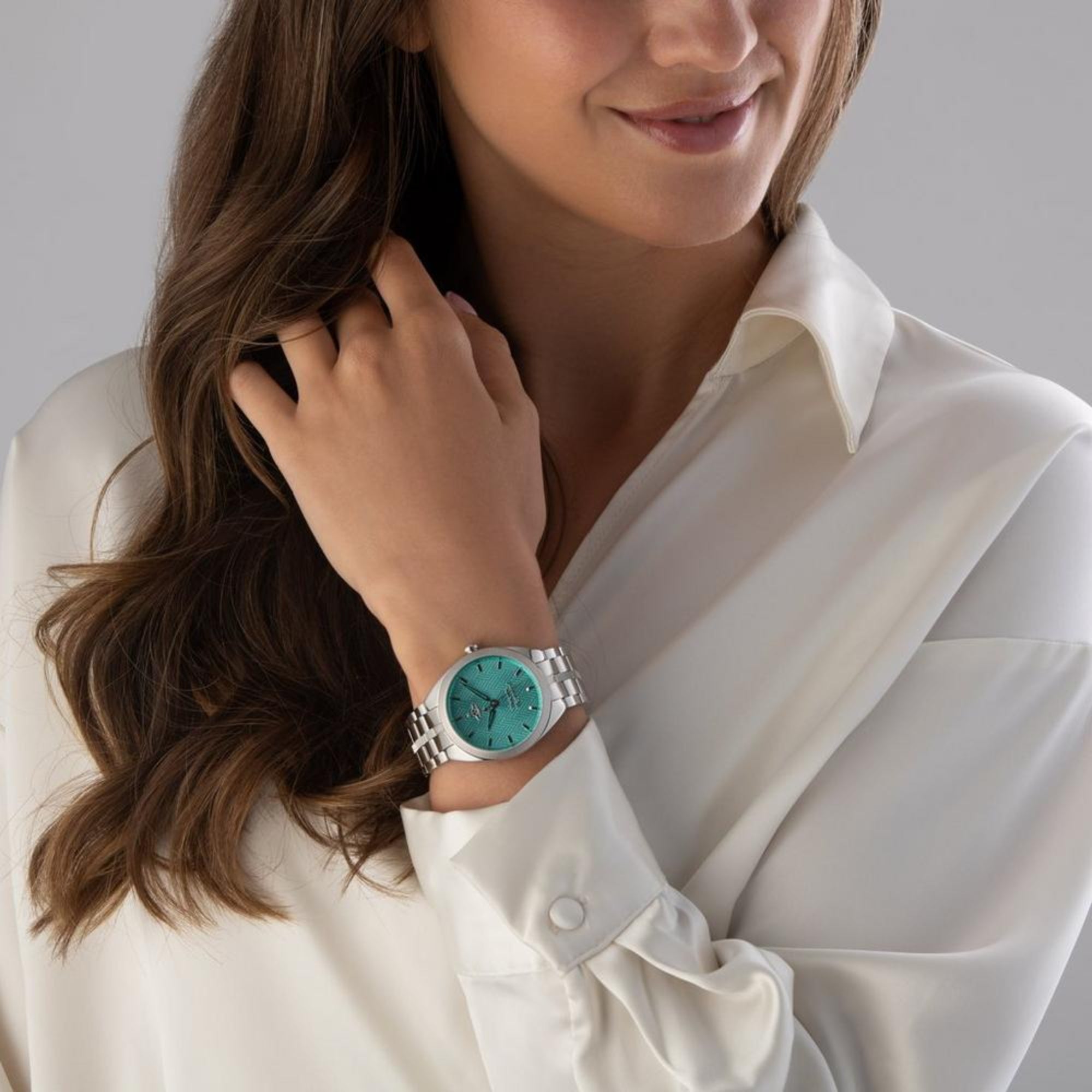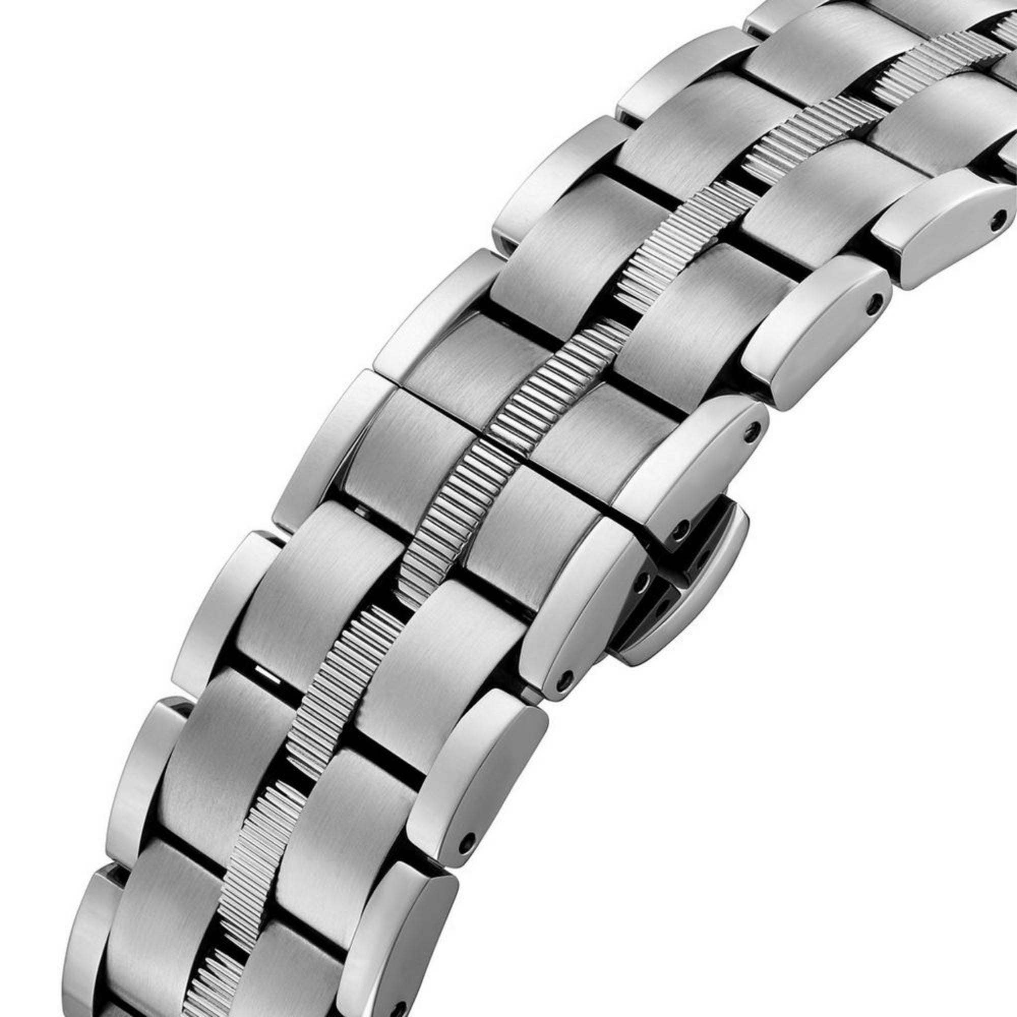The bracelet is a five-link stainless steel design with a combination of brushed and polished finishes. The visual contrast created by the different finishes adds another layer of interest and detail to the watch. The bracelet also ensures a comfortable and secure fit, making it perfect for any occasion.