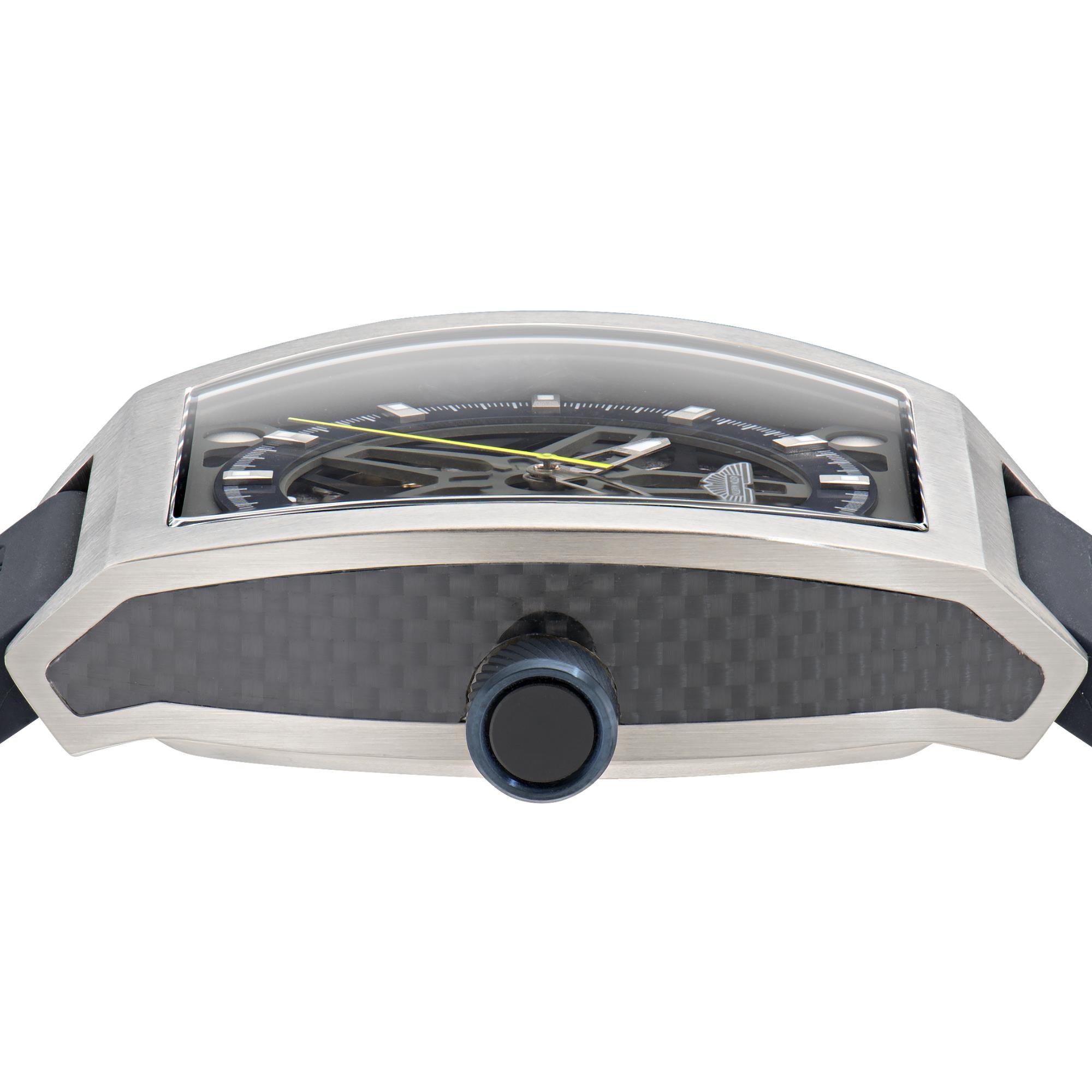 The Aston Martin AML THRILL TRG MTRT1F503 delivers bold performance with refined sport-luxury detailing. Its 41 mm tonneau-shaped case in recycled stainless steel integrates titanium and carbon fibre elements, striking the perfect balance between strength and elegance. The open skeleton dial, inspired by the DBS GT Zagato wheel rims, reveals the automatic movement beneath, while the Podium Green rotor remains visible through the transparent case back—an unmistakable tribute to Aston Martin’s racing DNA.