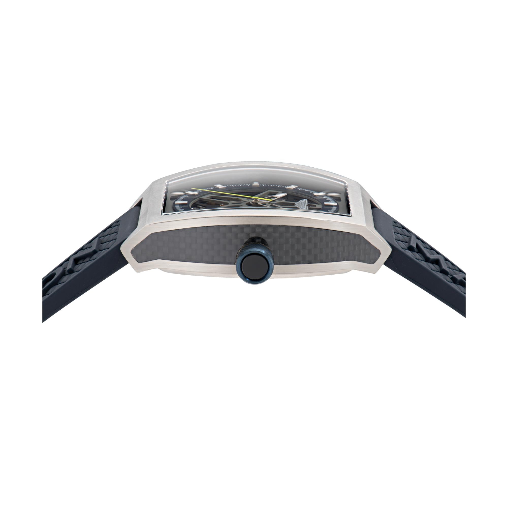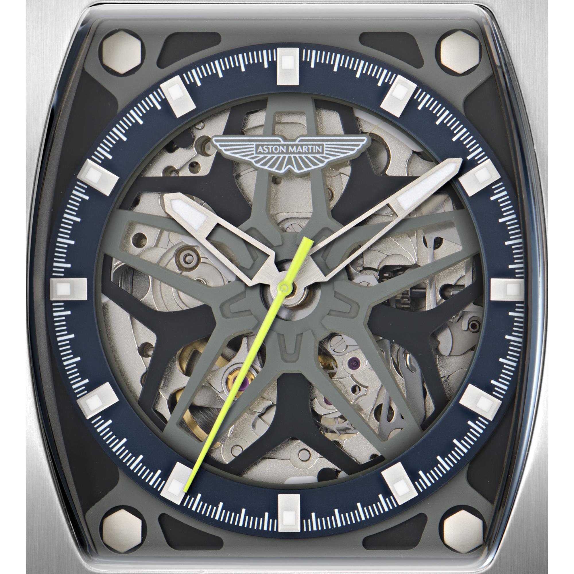Paired with a performance-textured navy blue silicone strap, echoing Aston Martin seat stitching, the TRG ensures all-day wearability. Secured with a titanium-accent buckle, it sits confidently at 14 mm thick and just 73 g in weight, combining presence with comfort.