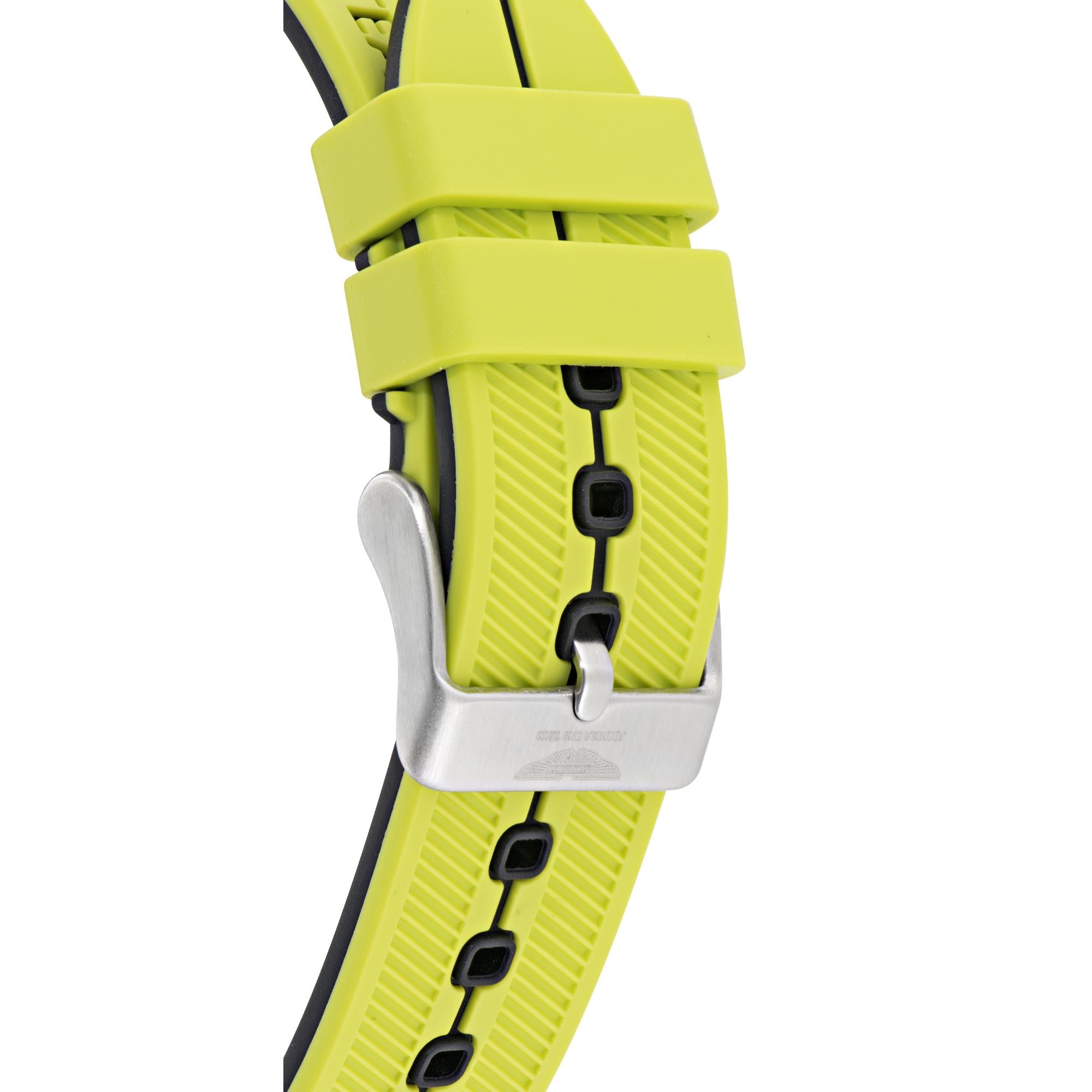 This PIT watch embraces the unmistakable identity of Aston Martin Formula One, combining motorsport heritage with modern wearability. The dual-tone silicone strap blends yellow and black in a dynamic pairing, accented by a central stripe and official branding from the Aston Martin Formula One Team and Aramco. The strap is designed not only for visual impact but also for comfort, secured with a matte stainless-steel buckle and fitting wrist sizes from approximately 150 to 205 mm. The overall look is sleek yet athletic, a perfect extension of the racetrack’s vibrant energy.