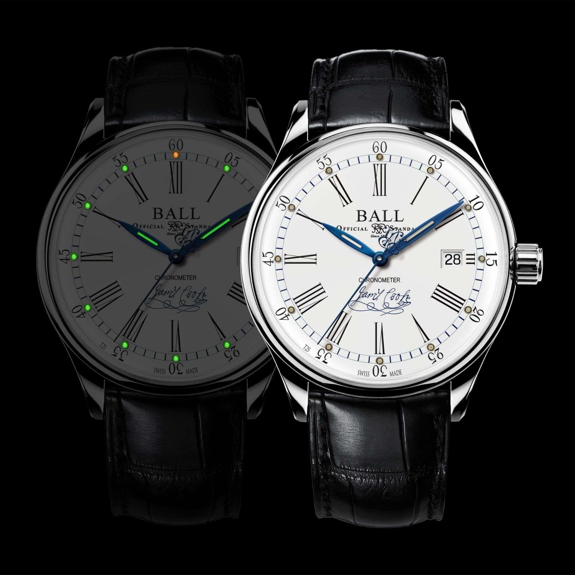The roman numerals that surround the dial play into this historical design language. Furthermore the micro tritium gas tubes marking each hour around the dial have been given an appearance of aged luminous paint to reflect the vintage feel of the watch. These micro gas tubes provide superior brightness as they’re 100 times brighter than markings using luminous paint. Unlike conventional luminous paint, they do not need recharging from the sun, allowing them to glow for 25 years. The tubes feature bright green tritium, with orange tritium being used at 12 o’clock for easy orientation in the dark. The blued leaf hand set of the dial offer a level of sophistication and elegance that play well into the design. The thin seconds hand adds a nice level of detail with the BALL logo on the counterbalance. At the 3 o’clock position is a matching date wheel, blending nicely with the dial. Proudly situated at the 6 o’clock position is Captain James Cook’s signature. These stunning design elements are all protected by an anti-reflective sapphire crystal.