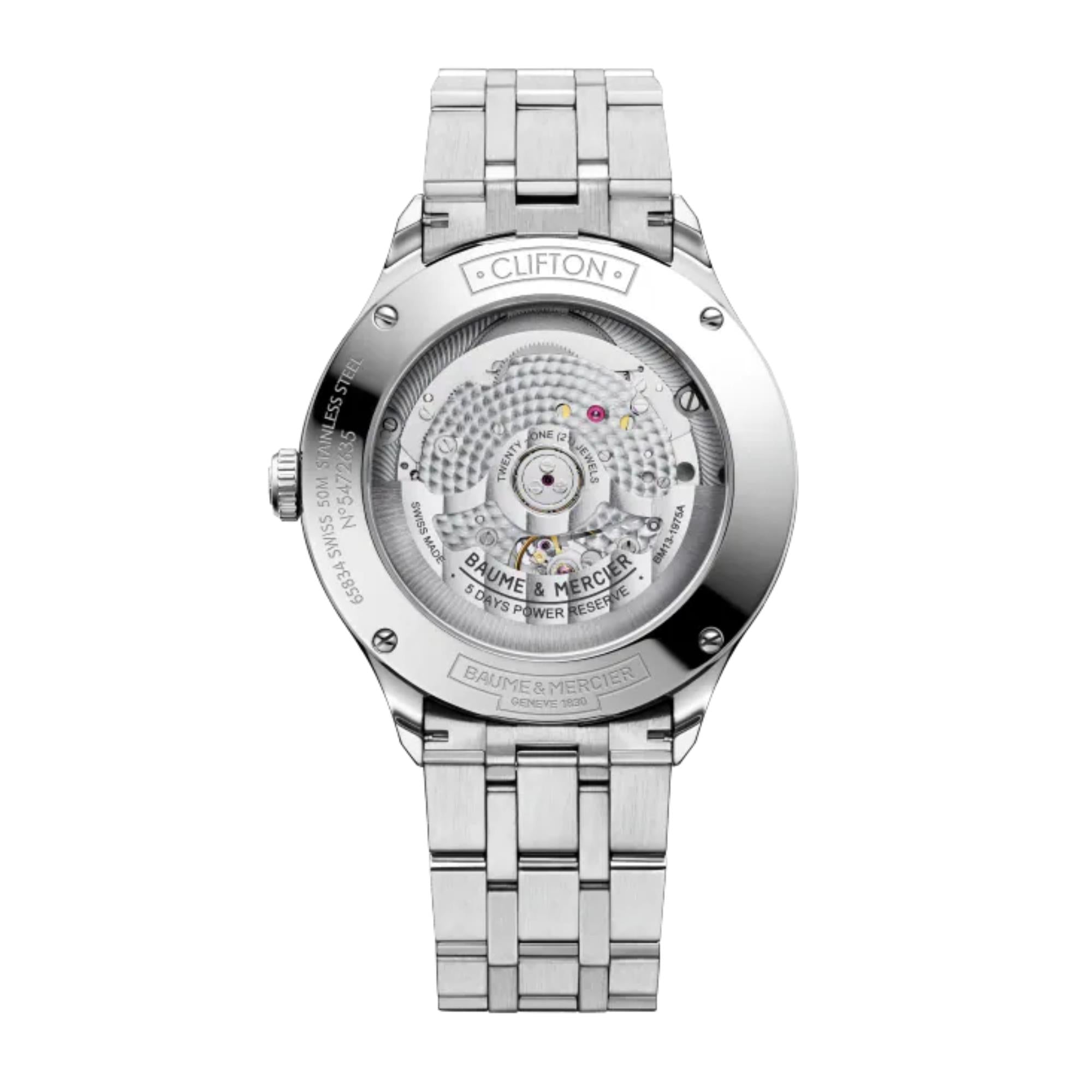 The Baume & Mercier Clifton BM0A10468 is presented in a circular stainless steel case that measures 40mm in width and 11.3mm in depth. The body of the case has been treated to a fine satin-brushed finish, while the fixed bezel is treated to a polished finish, creating a distinct visual demarcation. It also features a push/pull crown at 3 o’clock. The watch is protected by sapphire crystal glass, ensuring enduring clarity through exceptional scratch resistance. Sapphire crystal is also used on the back of the case for the exhibition caseback that provides the wearer with an insight into the watch’s inner movements.
