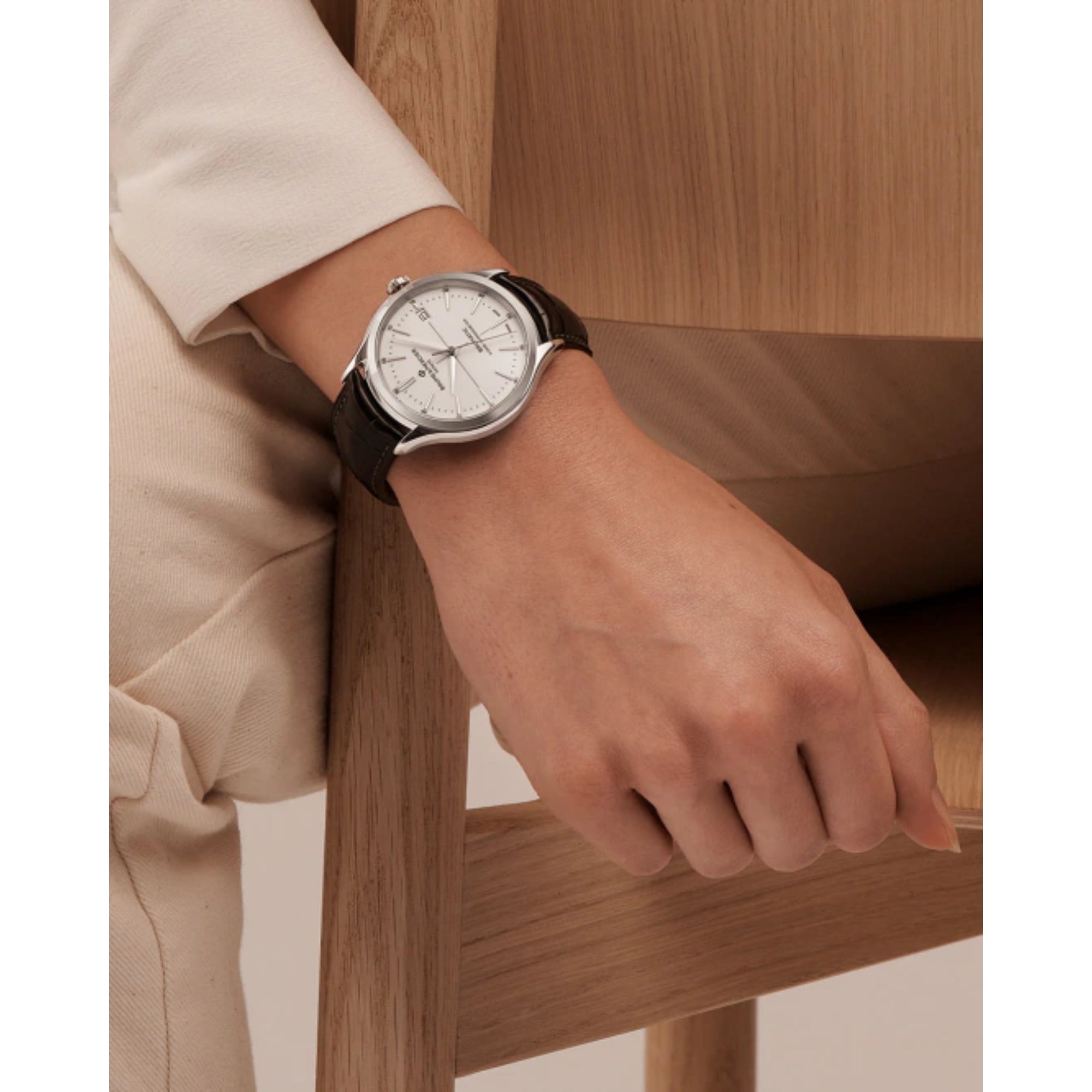 The dial showcases a minimalist white design, complemented by polished bevelled baton-style hour markers that are interspersed by a 60-second scale. It also features a polished Alpha-style handset and a black date-display aperture at 3 o’clock.