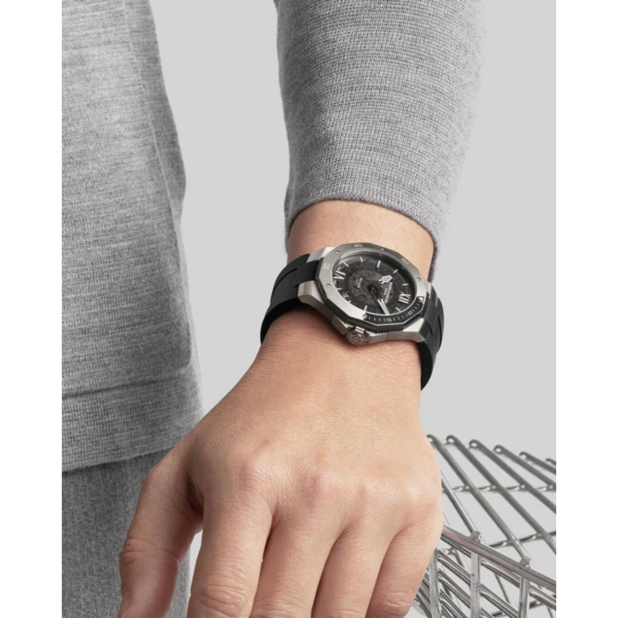 The dial is presented in a smokey grey transparent hue that exposes the watch’s inner movements. It exhibits a combination of silver framed baton-style and Arabic hour markers that have been filled with super-luminova that enables them to be read in the dark. Likewise the tips of the silver handset have also been generously coated in luminous material. It also features a date-display aperture at 3 o’clock.