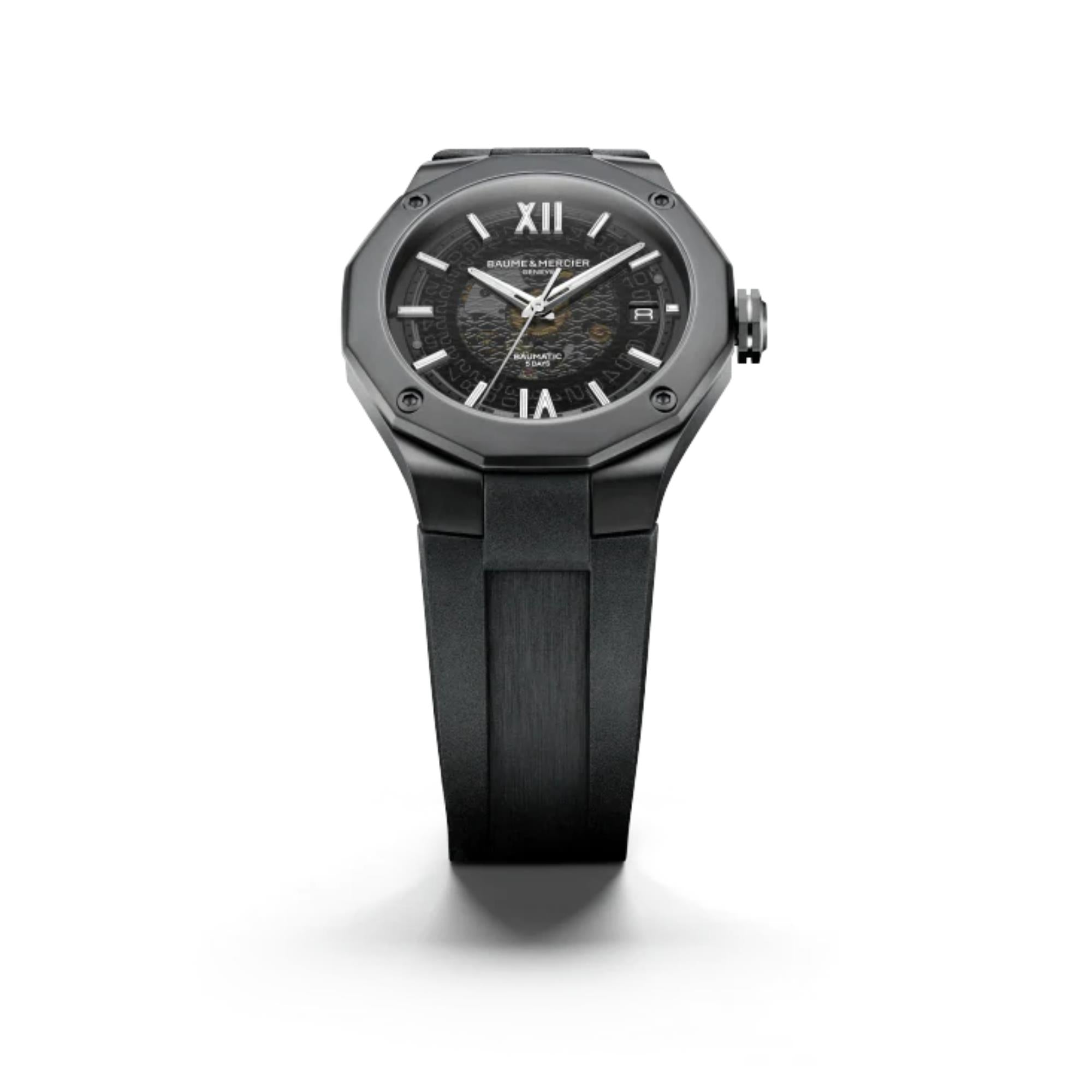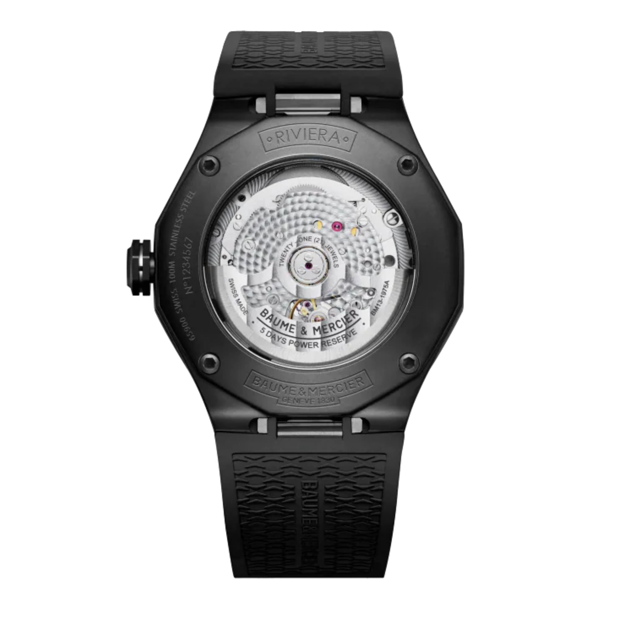The Baume & Mercier Riviera boasts a black steel-ADLC case that measures 42.1mm in diameter and 10.66mm in thickness. It showcases a dodecagonal bezel equipped with four screws and polished sides. It also features a push-pull crown that is located at 3 o’clock, it is embossed with the Baume & Mercier logo. The watch is protected by sapphire crystal glass, ensuring enduring clarity through exceptional scratch resistance. Sapphire crystal is also used on the back of the case for the exhibition caseback that provides the wearer with an insight into the watch’s inner movements.