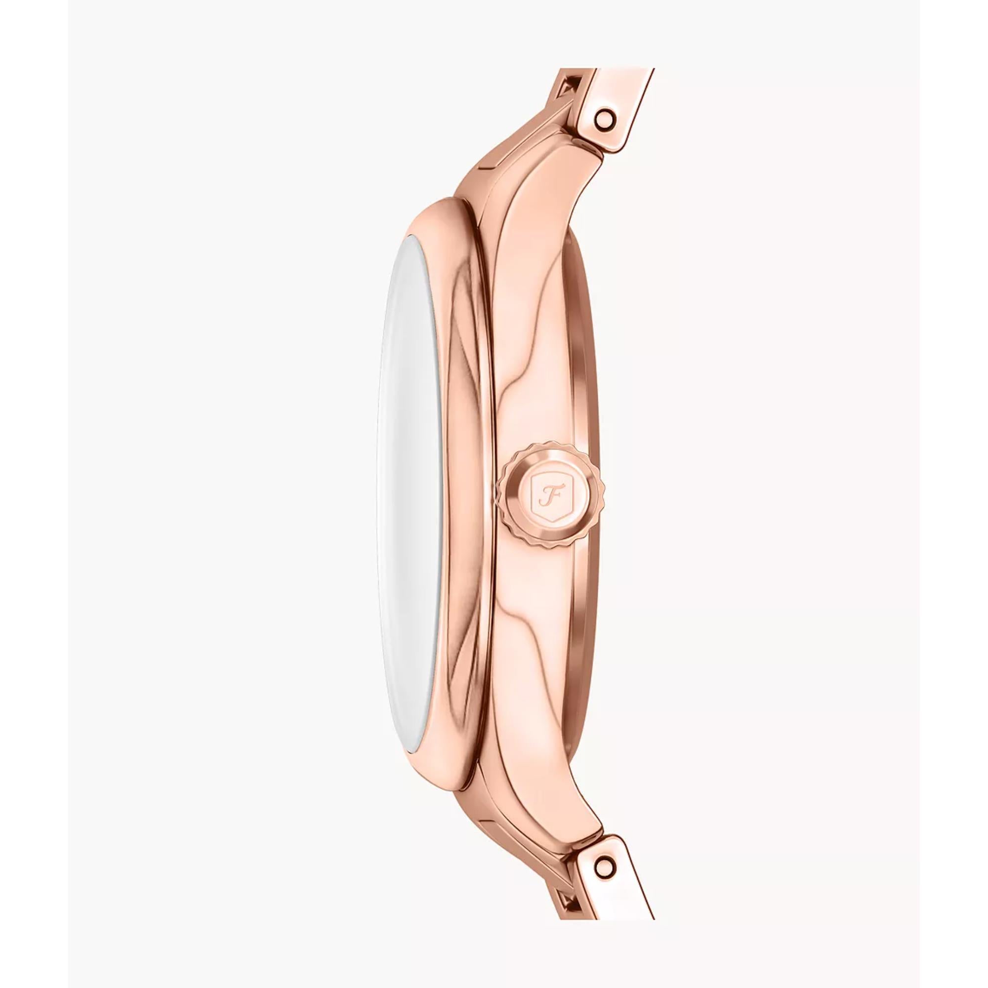 The Fossil Gilmore Three-Hand watch is crafted from rose gold-tone stainless steel. It features a small, round case. A matching bracelet creates a cohesive look. The silver dial has a satin and sunray finish. This adds subtle dimension and depth. Every detail speaks to quality and precision. This includes the smooth bracelet links. It also includes the refined dial finish.