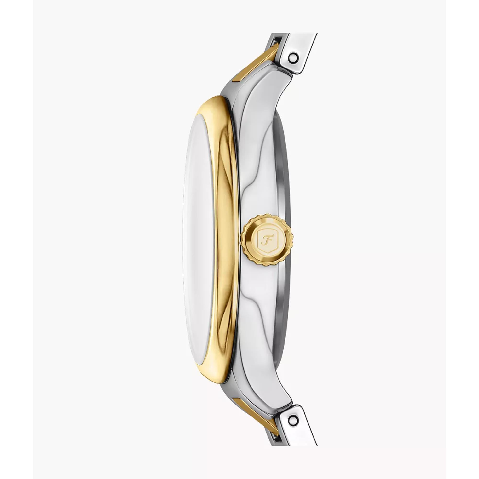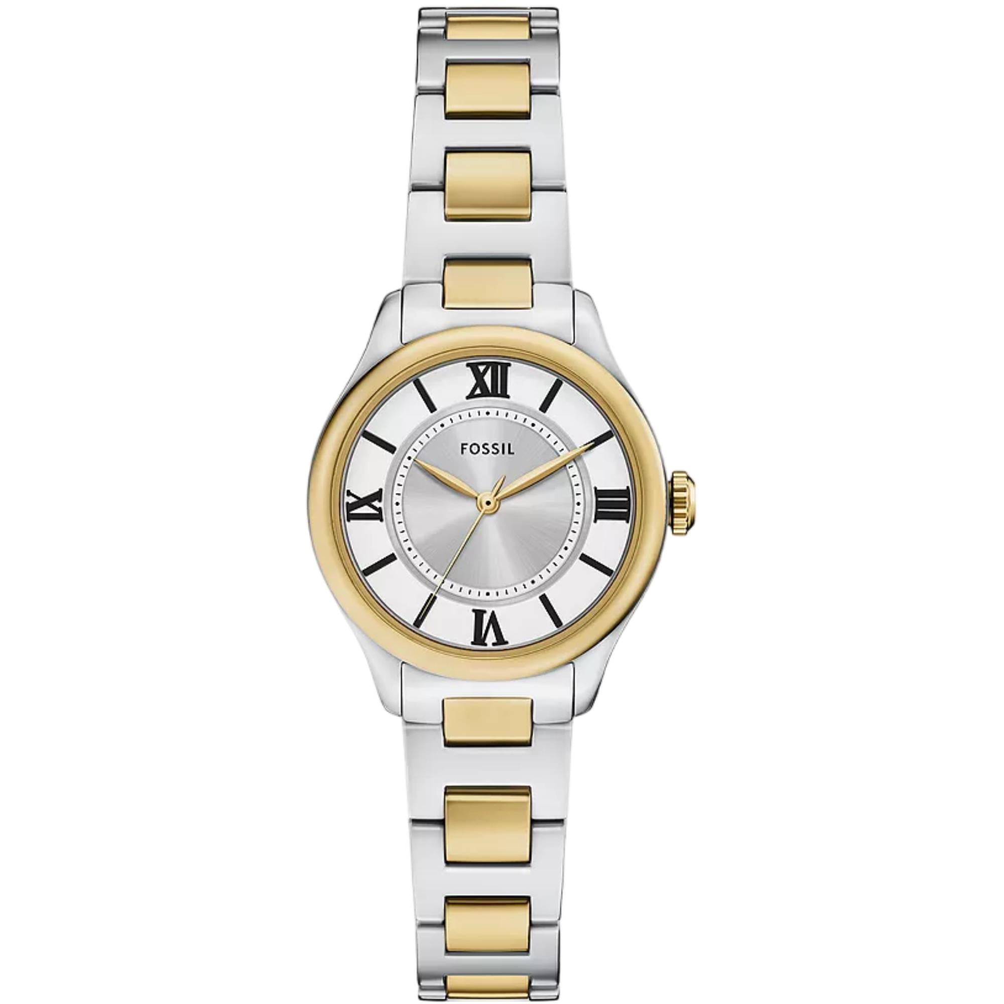 The Fossil Gilmore Three-Hand watch merges vintage-inspired design with modern versatility. This two-tone stainless steel timepiece features a silver-tone sunray dial. Its satin finish adds depth. The dial is paired with a gold-tone and silver-tone stainless steel bracelet. This creates a polished contrast. The small, round case maintains a refined profile. It is complemented by a clean three-hand design.