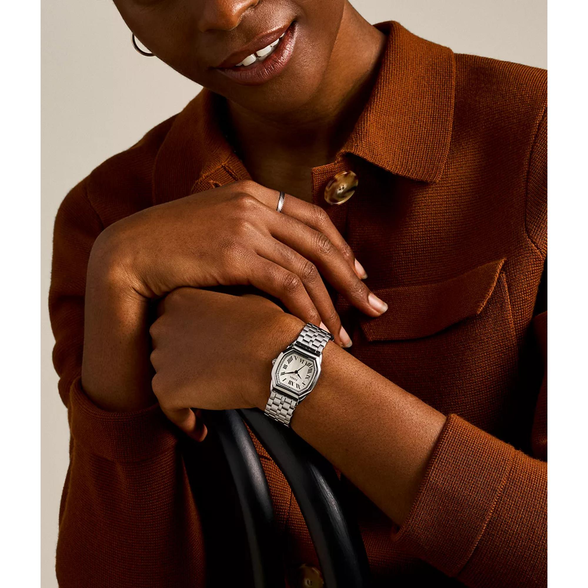 - The cream dial is soft and understated, providing a clean canvas for the silver-tone hour markers and hands. This creates an easy-to-read design, perfect for everyday wear.