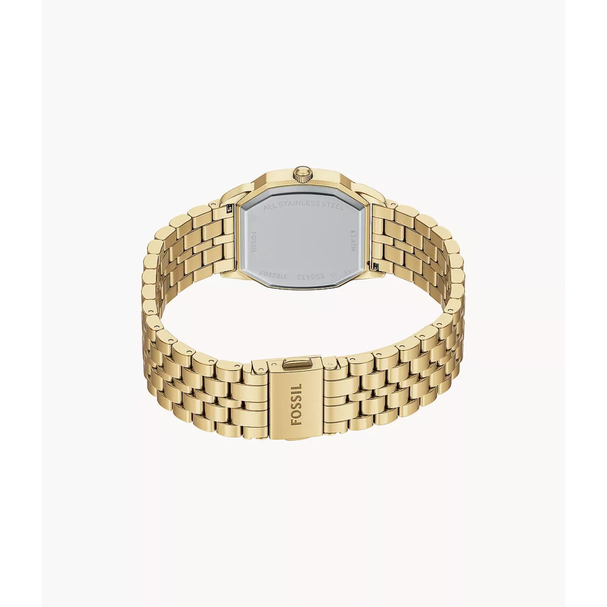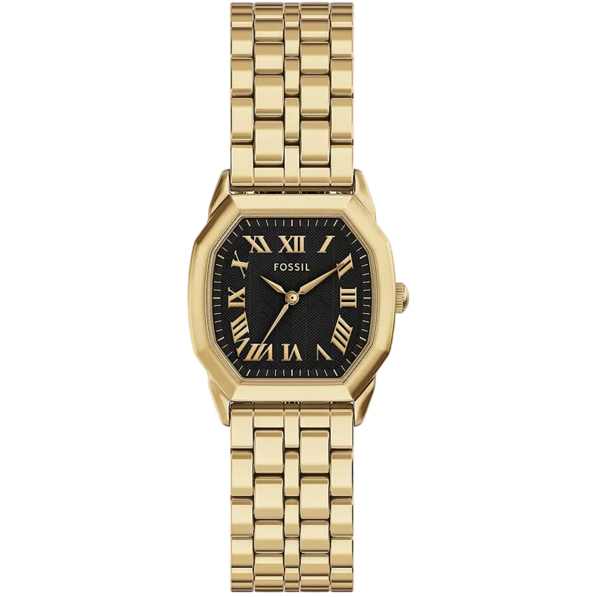 The Fossil Harlow Three-Hand watch draws inspiration from classic archival styles. It brings past sophistication to the modern day. This intricate timepiece features a polished gold-tone stainless steel finish. It has an octagonal-shaped case. A textured black dial complements its design. It uses a simple three-hand movement. This piece pairs modern materials with clean lines. It offers a refined yet approachable look.