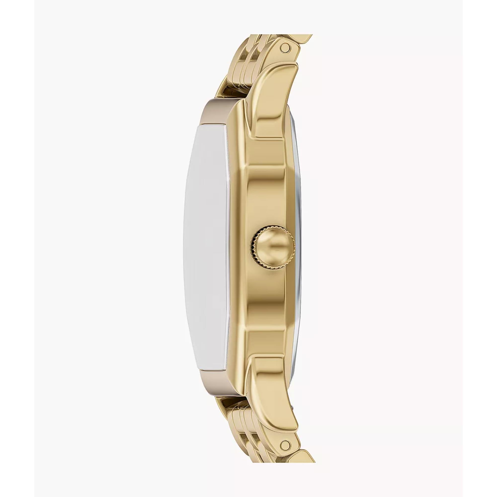 This watch is crafted with thoughtful precision. It is powered by a quartz three-hand movement. The case measures 27mm. It offers 3 ATM (30 metres) water resistance. This makes it suitable for splashes. The gold-tone stainless steel five-link bracelet is 16mm wide. It secures with a double press deployant buckle. A mineral crystal protects the dial. This watch is a versatile and elegant accessory.