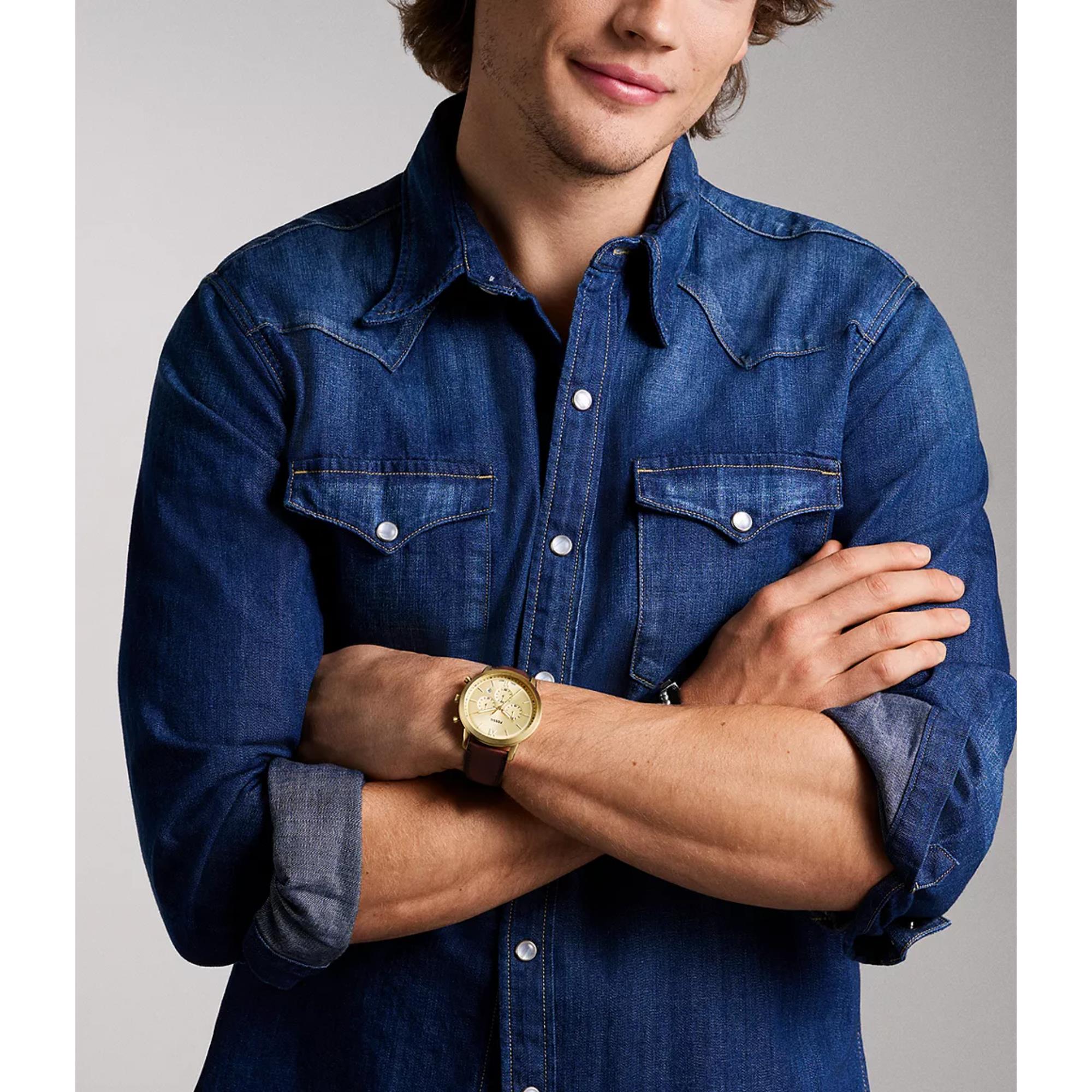The Fossil Neutra Chronograph FS6113 blends mid-century architectural inspiration with contemporary watchmaking. Its 44mm gold-tone stainless steel case offers bold presence, while the rich brown genuine leather strap introduces warmth and versatility. The gold sunray dial features sculpted gold-tone markers and hands, giving the piece a refined yet dynamic appearance.