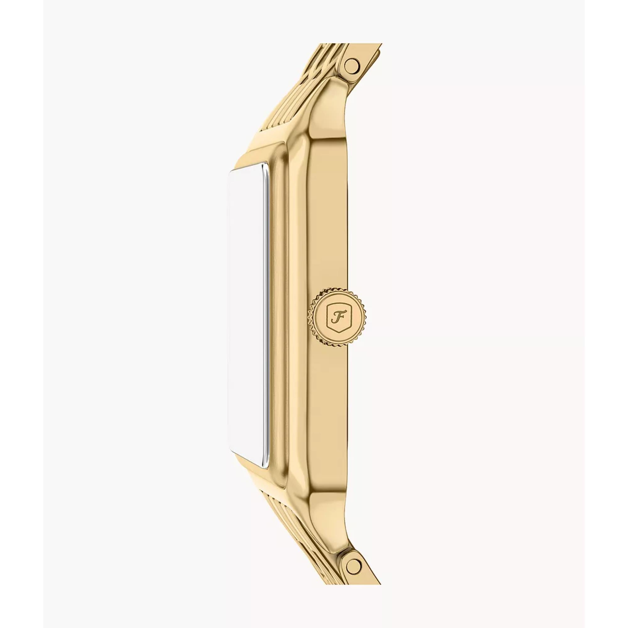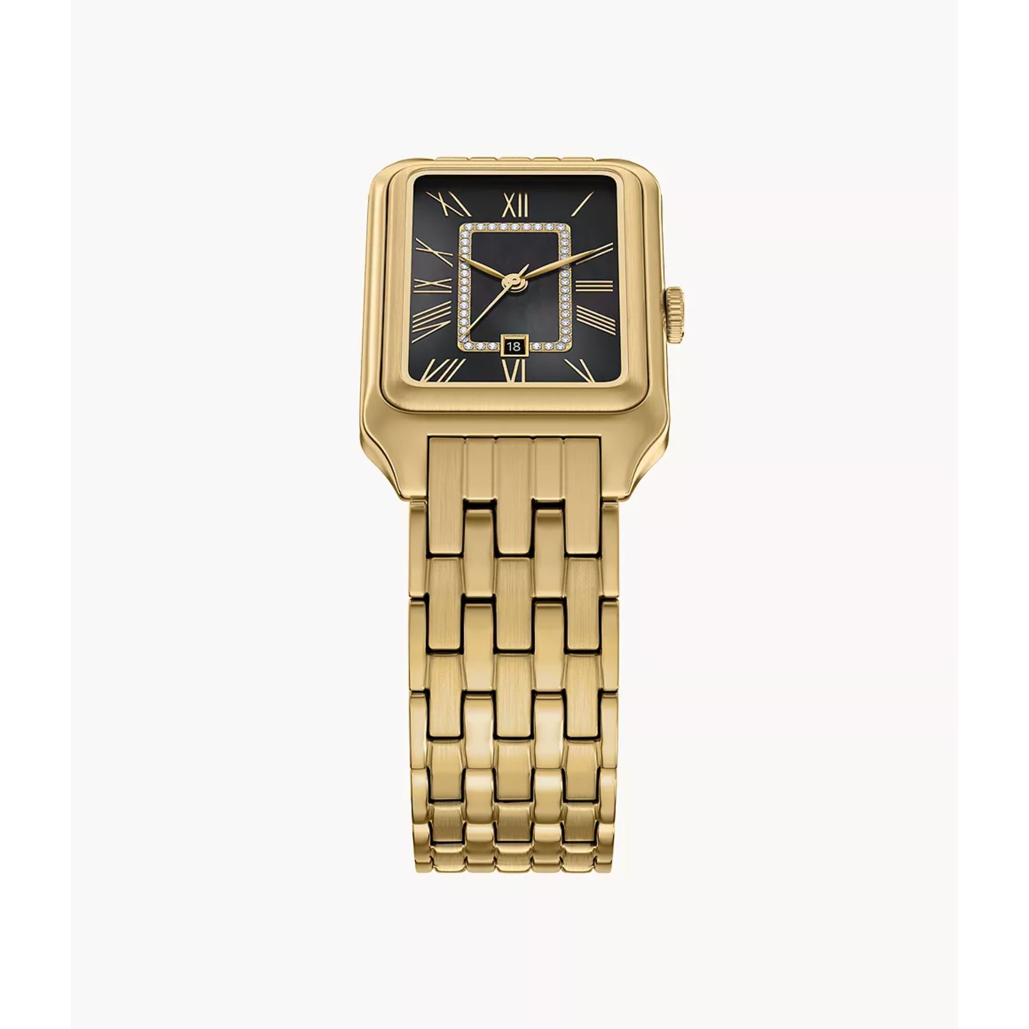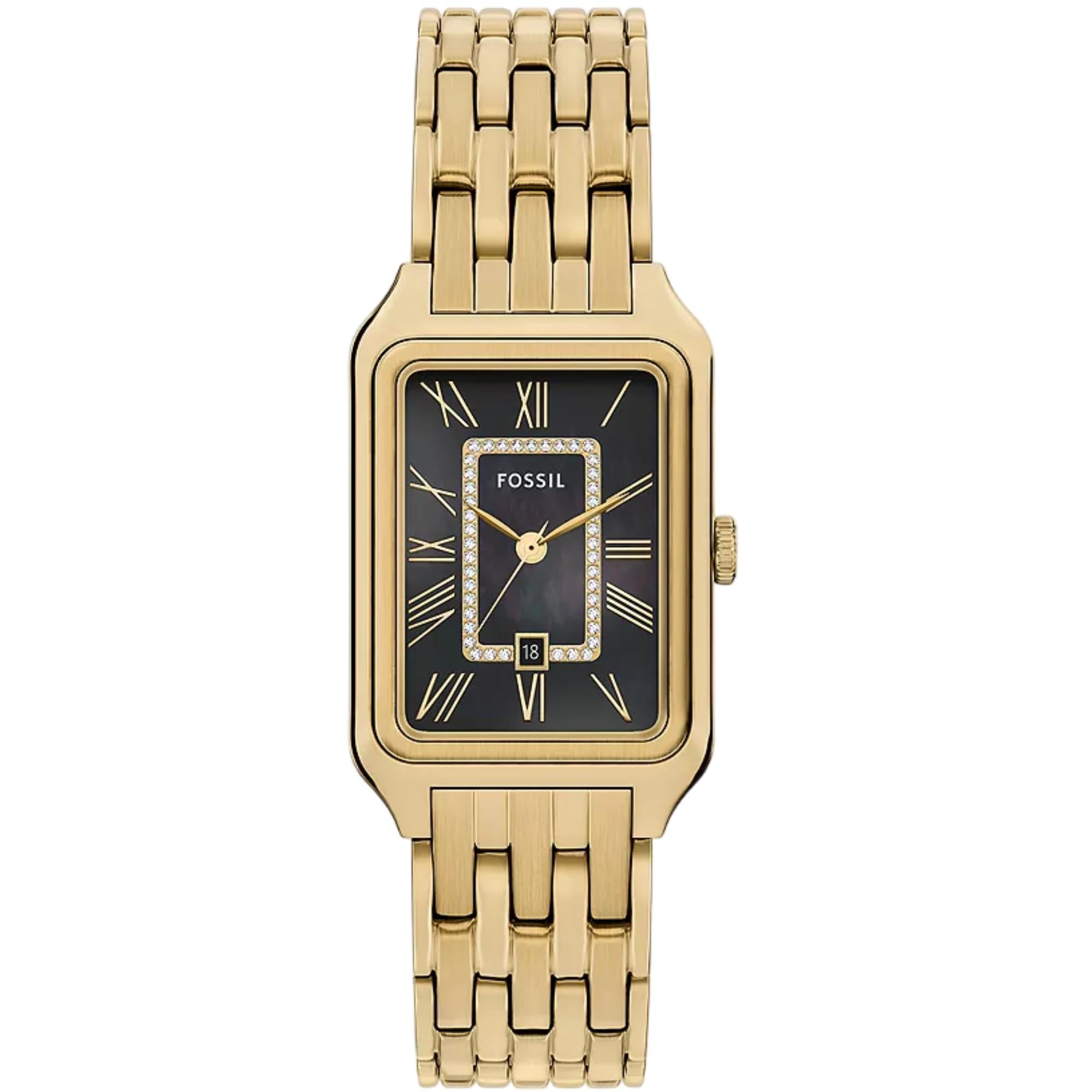 The Fossil Raquel Three-Hand Date watch is a timeless icon. It is reimagined for the modern era. Its rectangular gold-tone stainless steel case pairs with a matching bracelet. This creates a polished and cohesive design. The glossy mother-of-pearl dial adds depth and subtle iridescence. A glitzy inner border enhances its shimmer. This mid-sized watch balances refined details with modern versatility.