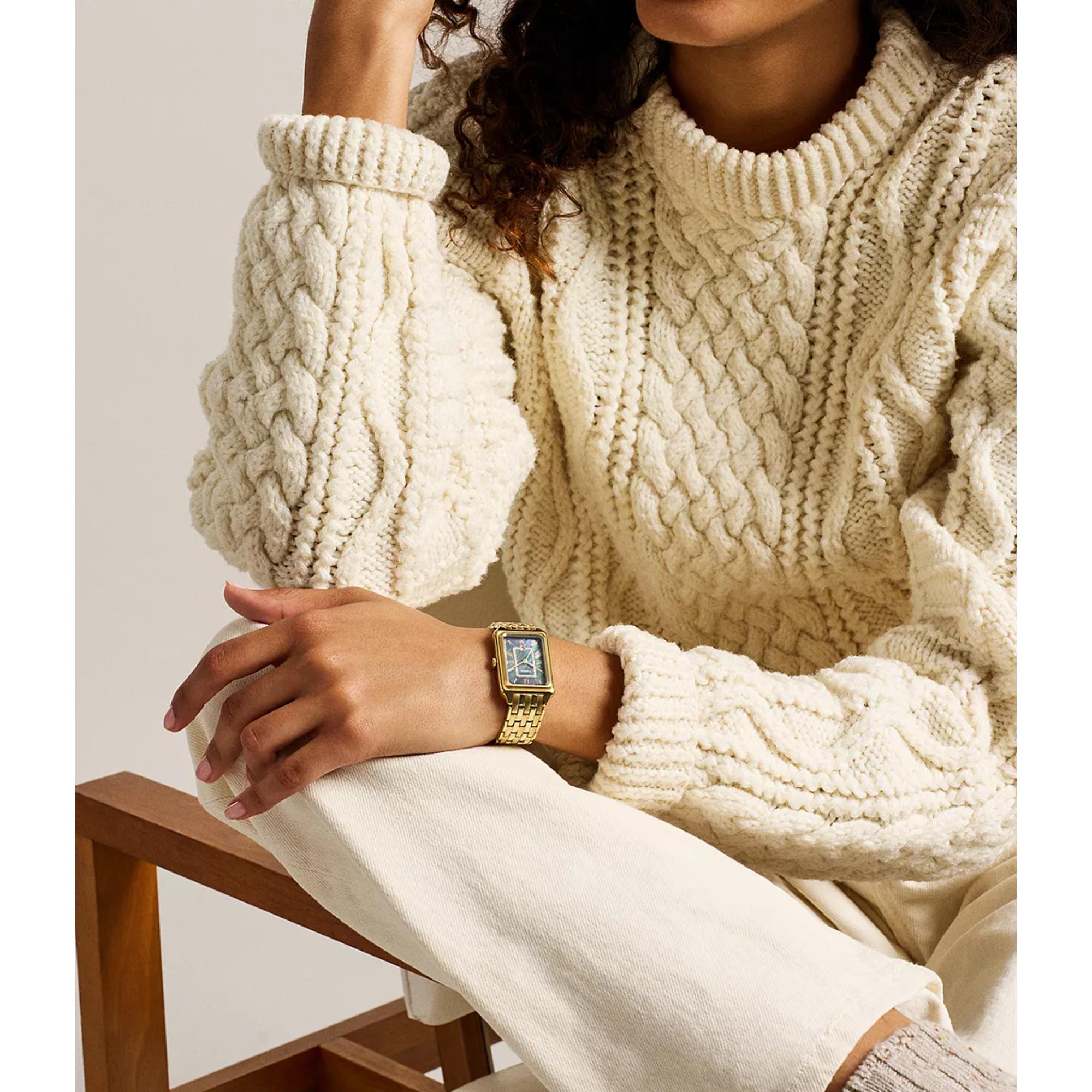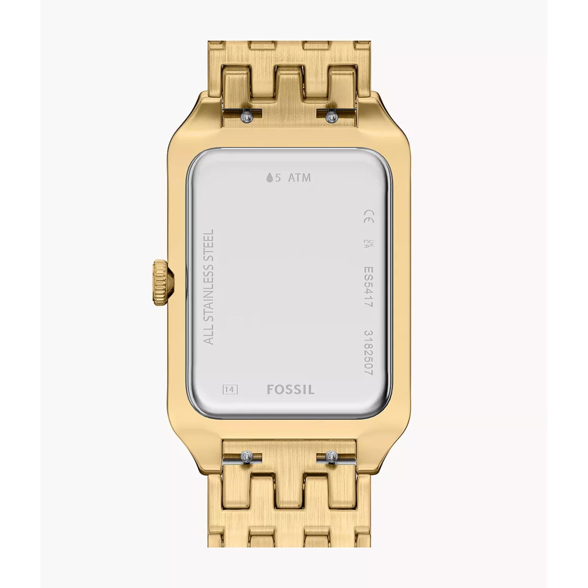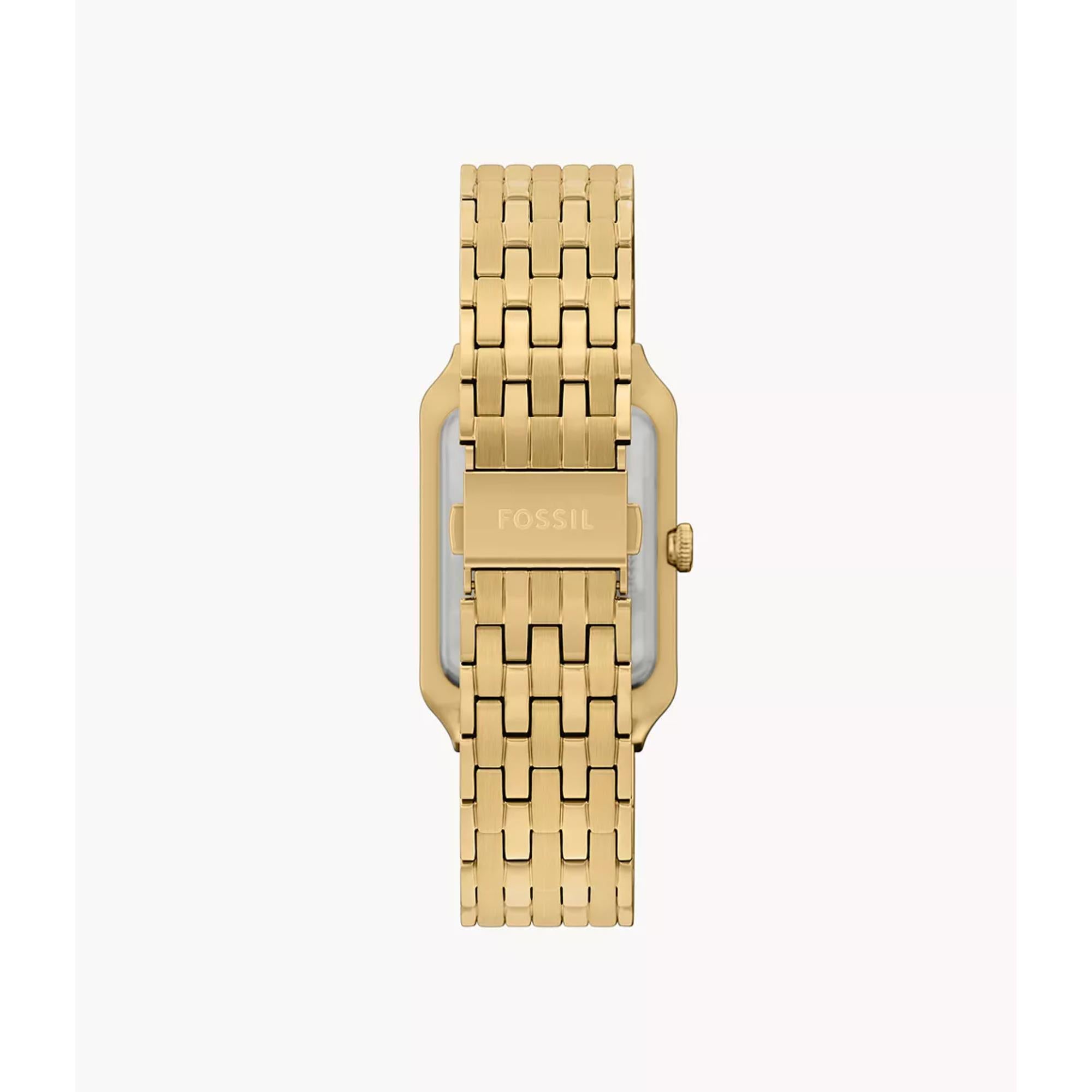 The Fossil Raquel Three-Hand Date watch is a timeless icon. It is reimagined for the modern era. Its rectangular gold-tone stainless steel case pairs with a matching bracelet. This creates a polished and cohesive design. The glossy mother-of-pearl dial adds depth and subtle iridescence. A glitzy inner border enhances its shimmer. This mid-sized watch balances refined details with modern versatility.