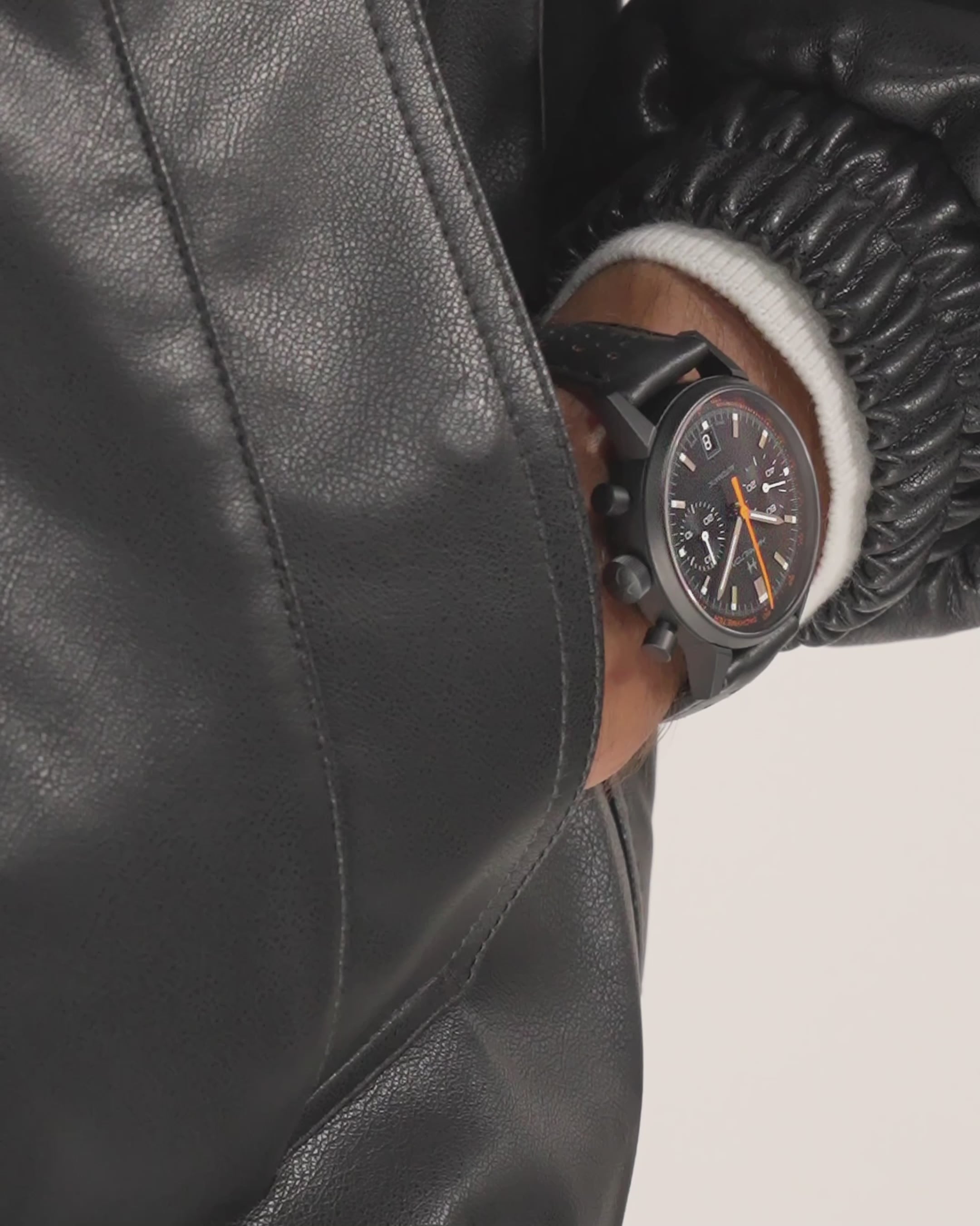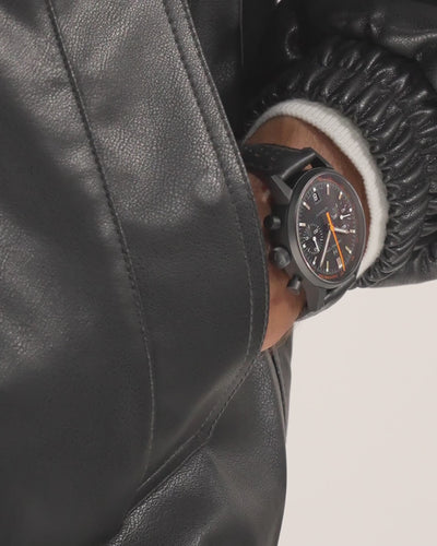 The Hamilton Intra-Matic Auto Chrono H38446732 combines vintage racing heritage with bold, contemporary design. Its 40mm stainless steel case is coated in black PVD, creating a sleek, stealthy look that’s both sporty and refined. The matte black dial is accented by vibrant orange details on the hand and tachymeter scale, adding a lively contrast to the otherwise monochrome palette.