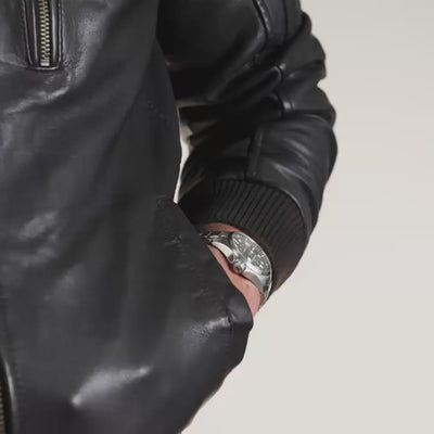 The black satin‑finish dial is marked by large white Arabic numerals, along with a minute track around the periphery, providing excellent readability. Skeleton-style hands coated with Super‑LumiNova® ensure visibility even in low light. A scratch-resistant sapphire crystal with anti-reflective coating protects the dial.