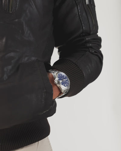 Set beneath a crisp, deep-blue dial, the watch displays bold Arabic numerals for enhanced legibility, accompanied by a day-and-date window at the three-o’clock position, an elegant nod to pilot-watch tradition.