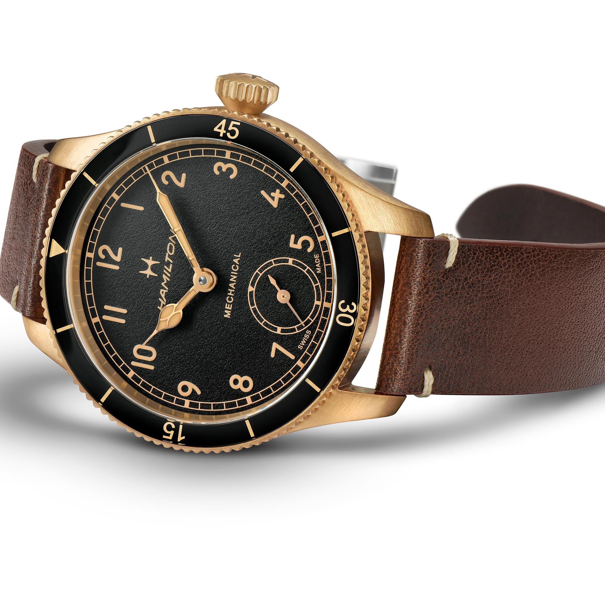 Hamilton has a long tradition in producing military and pilot watches, since it became the official supplier of wristwatches to the United States in the First World War. The design of this timepiece pays homage to the Model 23, which was a military spec watch that was supplied to the U.S. Air Force in WW1.
