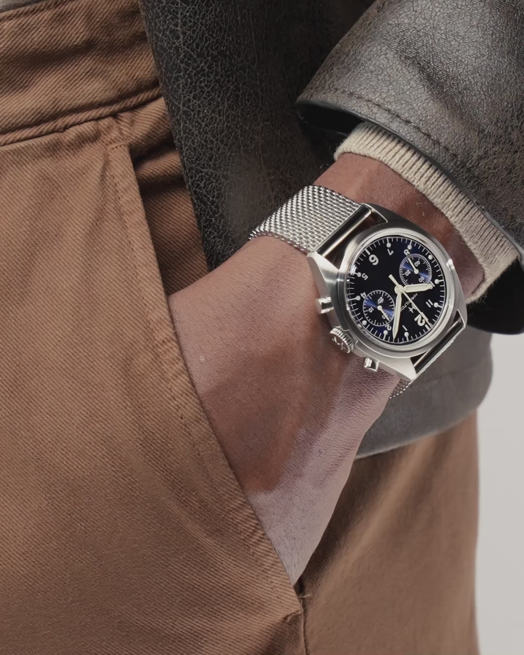 At the heart of this timepiece is the hand-wound Hamilton H-51-Si mechanical chronograph movement. This calibre boasts a state-of-the-art silicon balance spring for enhanced resistance to magnetic fields and temperature fluctuations. With an impressive 60-hour power reserve, this movement offers modern precision and reliability while maintaining the classic feel of a hand-wound watch.