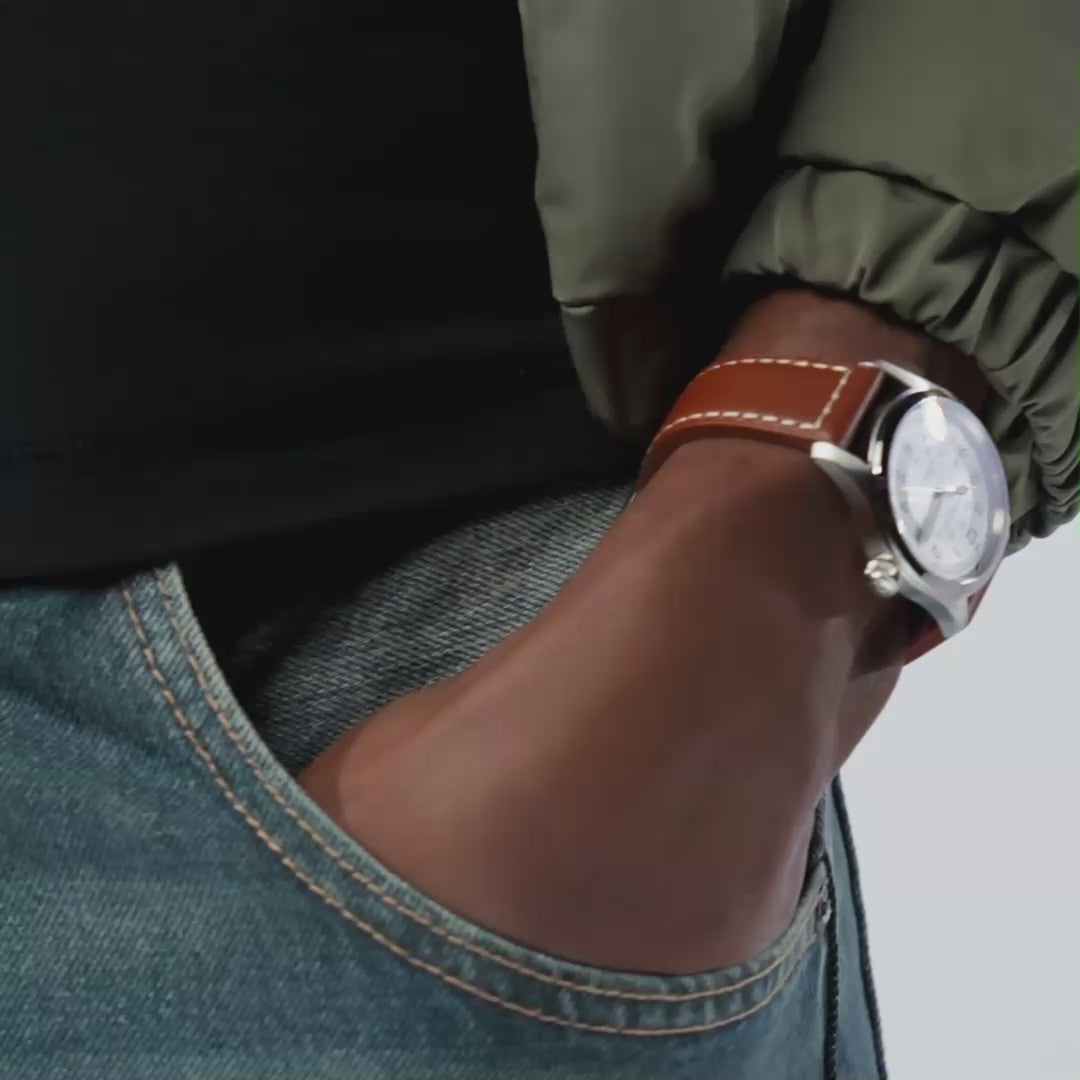 It comes with a brown cow-leather strap that adds a warm, vintage touch and pairs beautifully with the silver dial. The pin buckle ensures a secure, comfortable fit on the wrist.