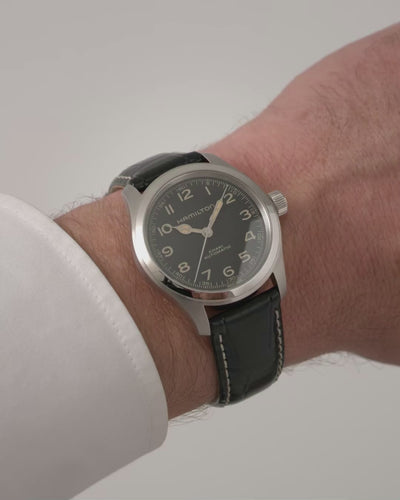The Khaki Field Murph Auto 38mm is here. One of the science fiction's most famous watches known by fans as 'The Murph' is now housed in a compact 38mm stainless steel case. Featuring ultra-readable black dial, beige vintage-style Super-LumiNova® finished hands and black leather strap, it reflects the key aesthetic codes of its 42mm predecessor. Powered by the H-10 automatic movement boasting an 80-hour power reserve, this Khaki Field Murph Auto will capture the hearts of those who are in love with smaller watches.