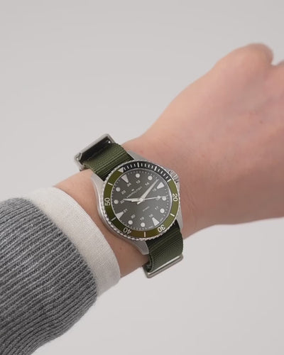 The watch is fitted with a durable green NATO strap, pairing seamlessly with the dial for a cohesive military-inspired look. Lightweight and breathable, the strap ensures comfort during extended wear, while the stainless steel buckle keeps the fit secure. The 37mm case size makes this model especially versatile, accommodating a wide range of wrist sizes without compromising its sporty identity.
