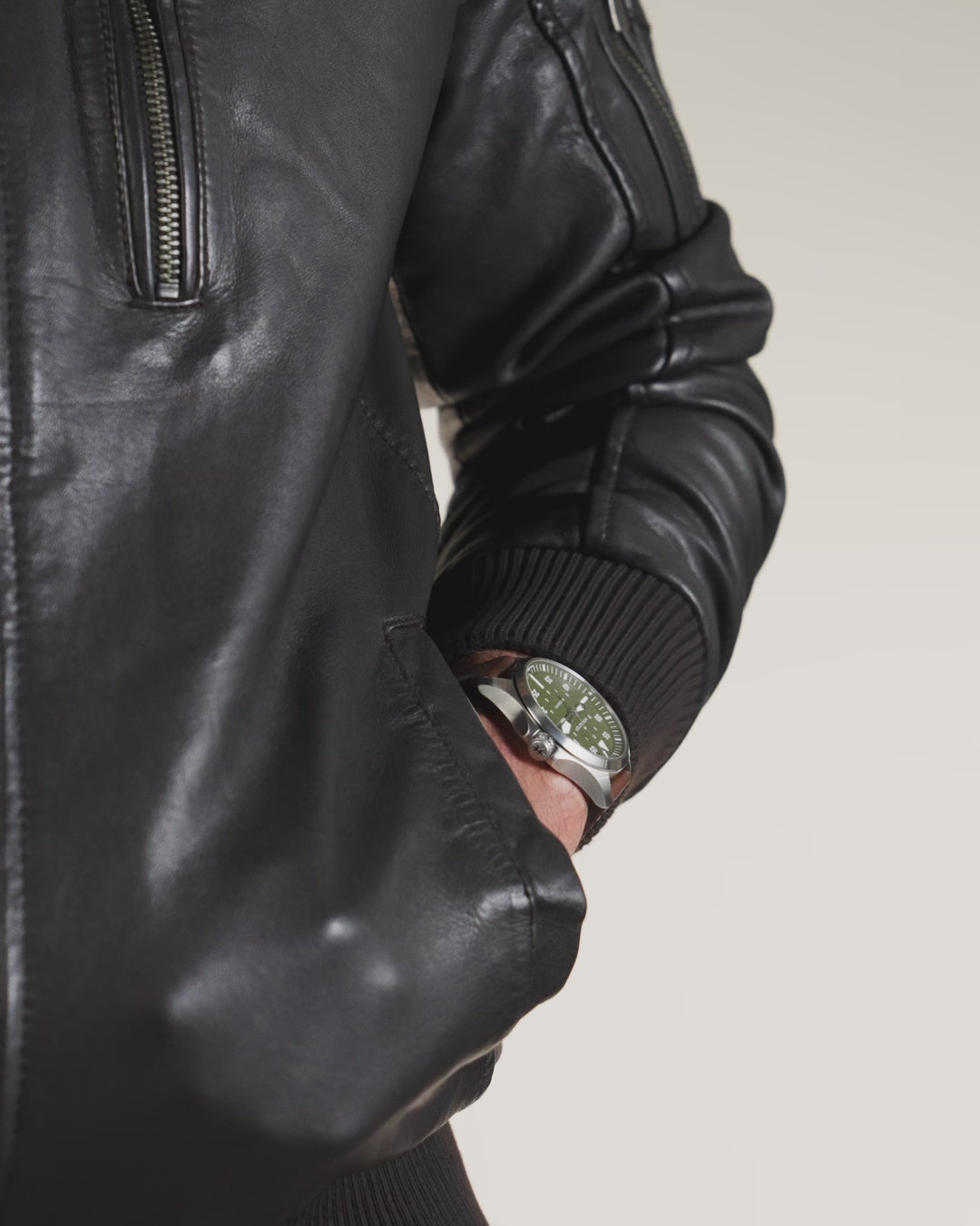 The rich olive-green dial features bold Arabic hour numerals, luminous sword-shaped hands and a prominent day-and-date window at 3 o’clock all hallmarks of the pilot-watch tradition.