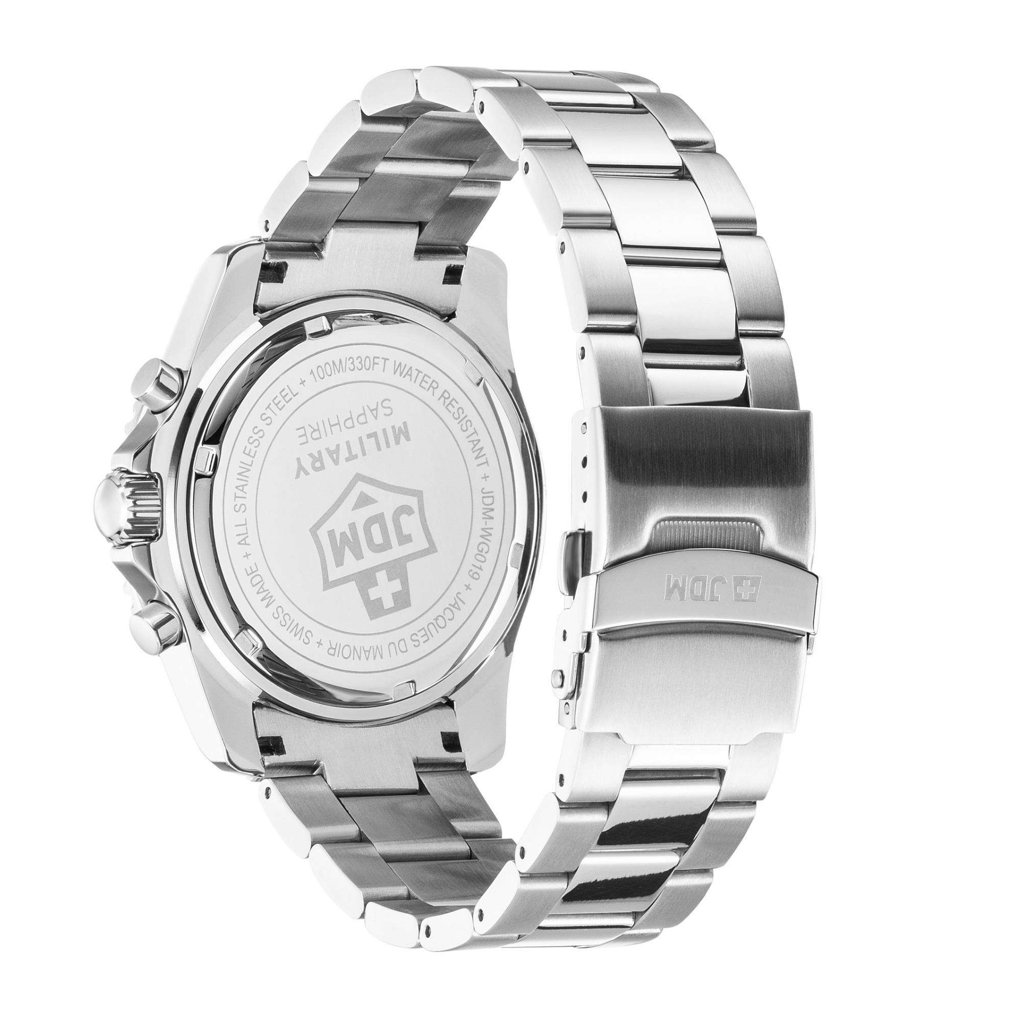 Crafted with meticulous attention to detail, the JDM Military Sierra Chrono features a sleek and captivating black dial, perfectly complemented by a silver stainless steel bracelet that exudes strength and elegance. Also, the sunburst dial design adds a touch of dynamism, catching the light and ensuring all eyes remain fixed on its mesmerizing beauty.