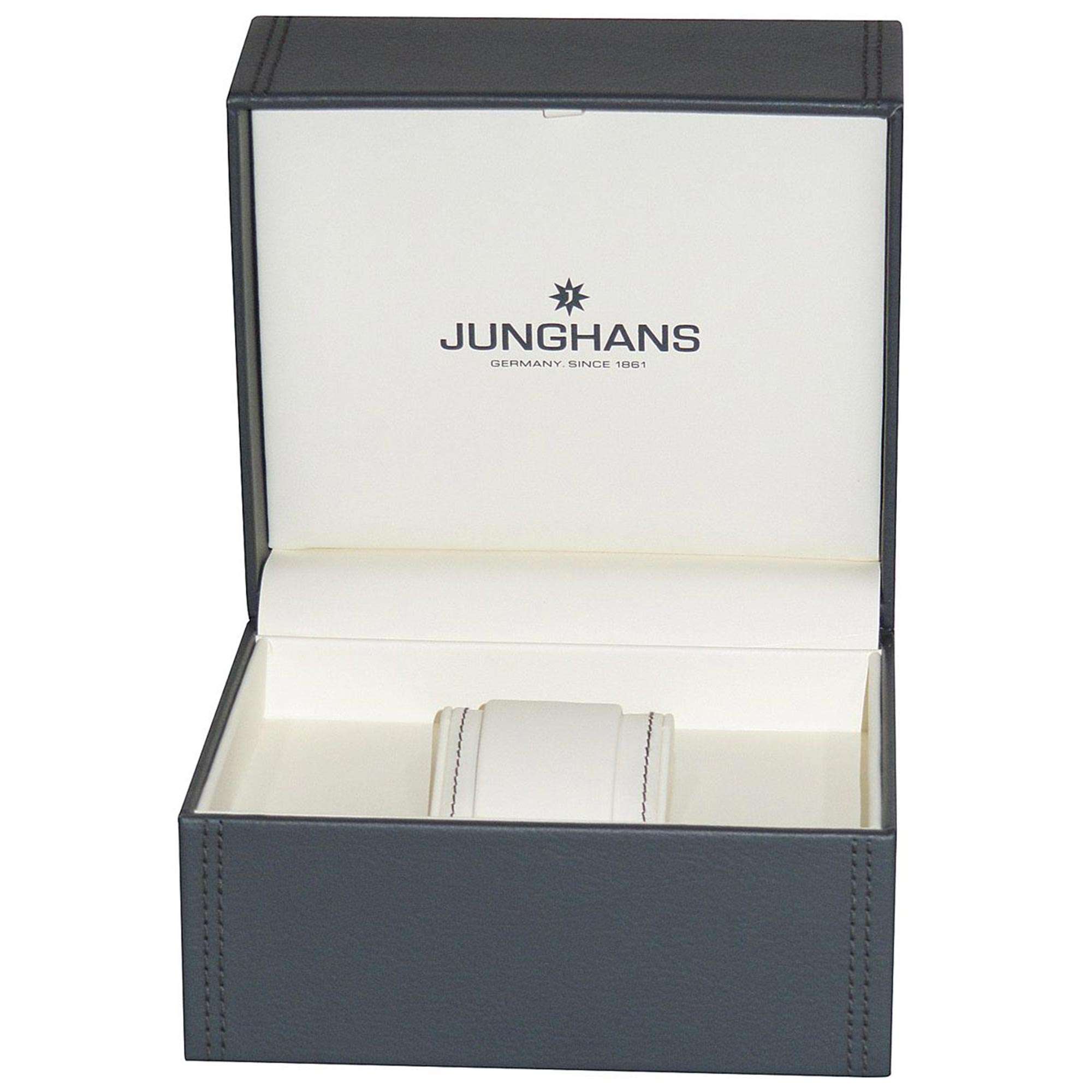 A black dial is complemented by matte black hands and grey indexes with environmentally-friendly luminous substance. The luminous substance allows makes the indexes and hands glow in the dark for easy visibility at all times. Around the very edge of the dial are second markers in a grey Arabic style for each five second increment separated by small black squares to represent each second. Positioned at the 12 o’clock position is the ever present Junghans logo with a date window adjacent to the 3 o’clock mark.