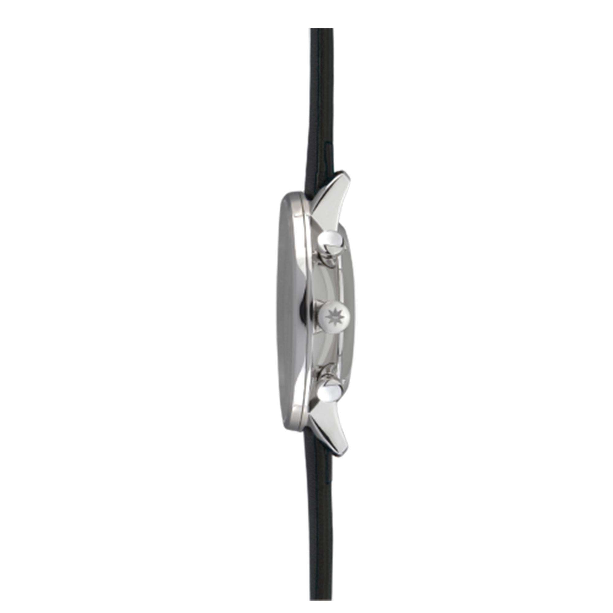 The silver dial is housed inside a silver stainless steel case. The back of the case features a screwed design which means that the watch’s water-resistance is ensured over a longer time. The crown, of which can be seen at the 3 o’clock position, then screws into the thread of the tube and gaskets are fitted to further enhance water-resistance. Guarding the crown are two buttons either side which are used to access the watches chronograph function. All in all, the case measures at a diameter of 40mm which complements the sleek height of just 10.5mm. Sat inline with the case is sapphire crystal glass which allows for both a clear view and a resistance to any potential knocks and bumps.