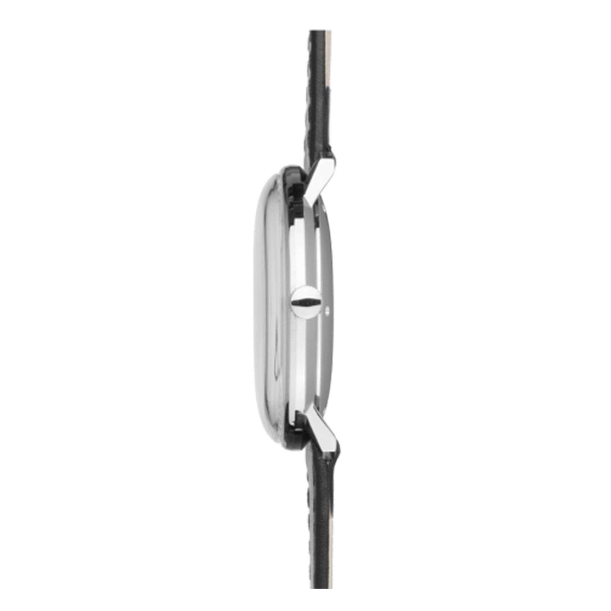 The minimalist black strap is crafted from calf leather, which allows it sit comfortably upon your wrist. It fastens using a standard stainless steel buckle.