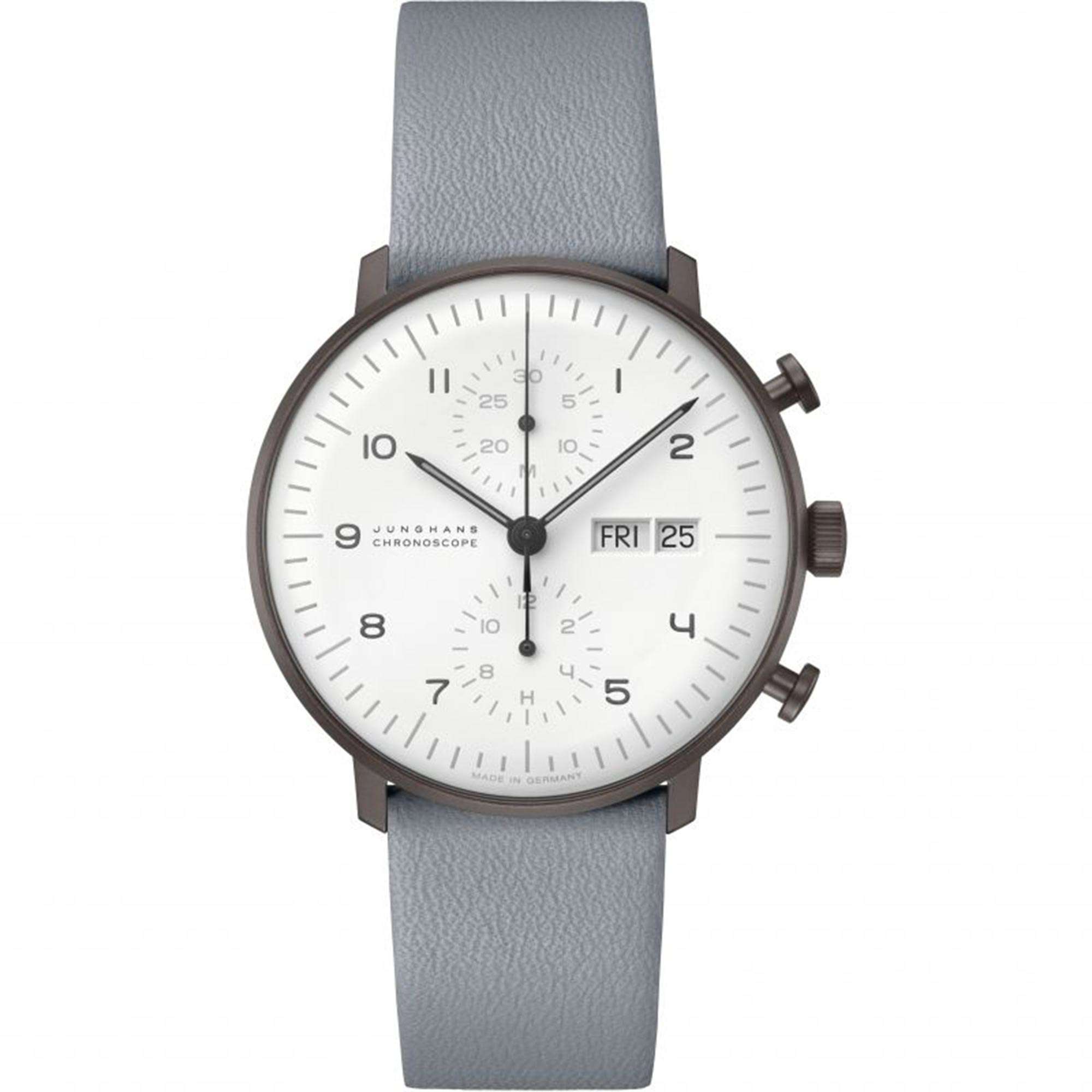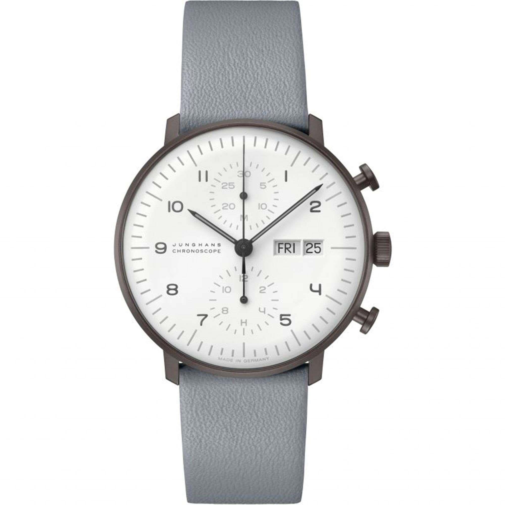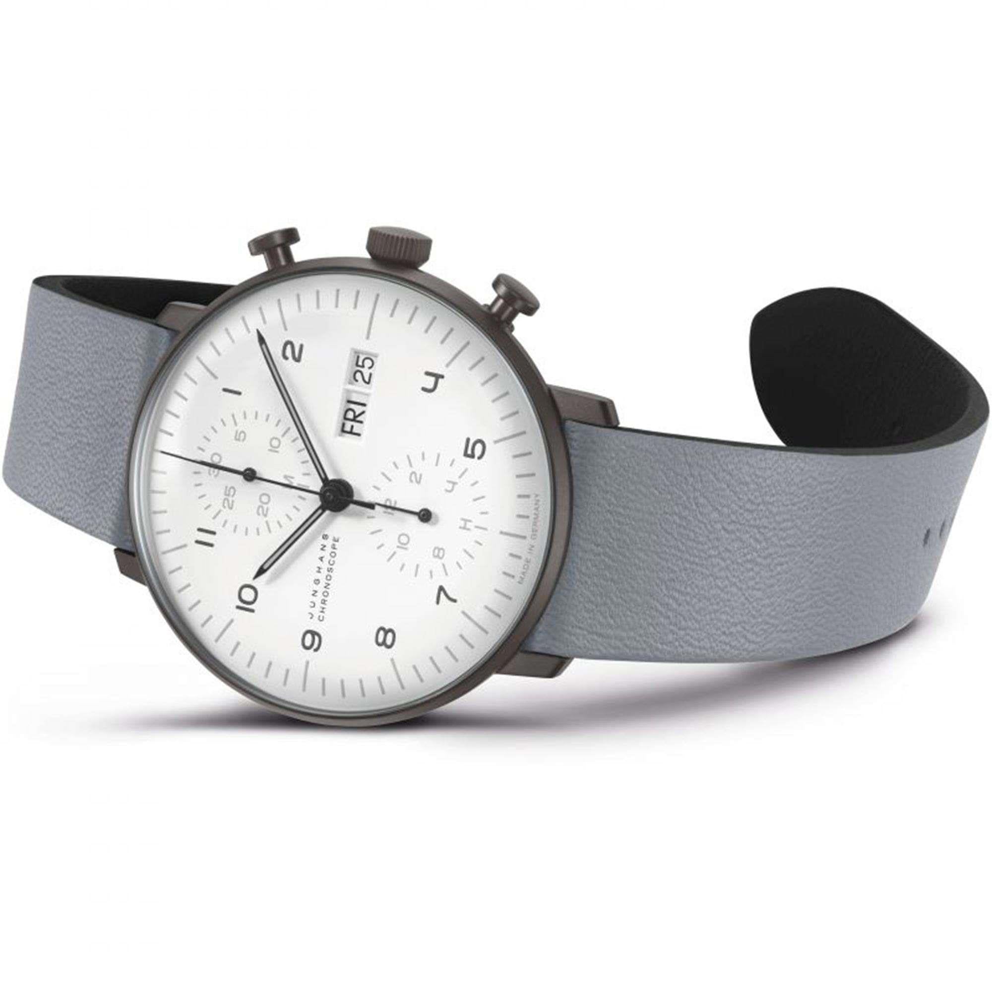 Junghans Max Bill Chronoscope Automatic White Dial Grey Leather Strap Mens Watch 027/4008.05