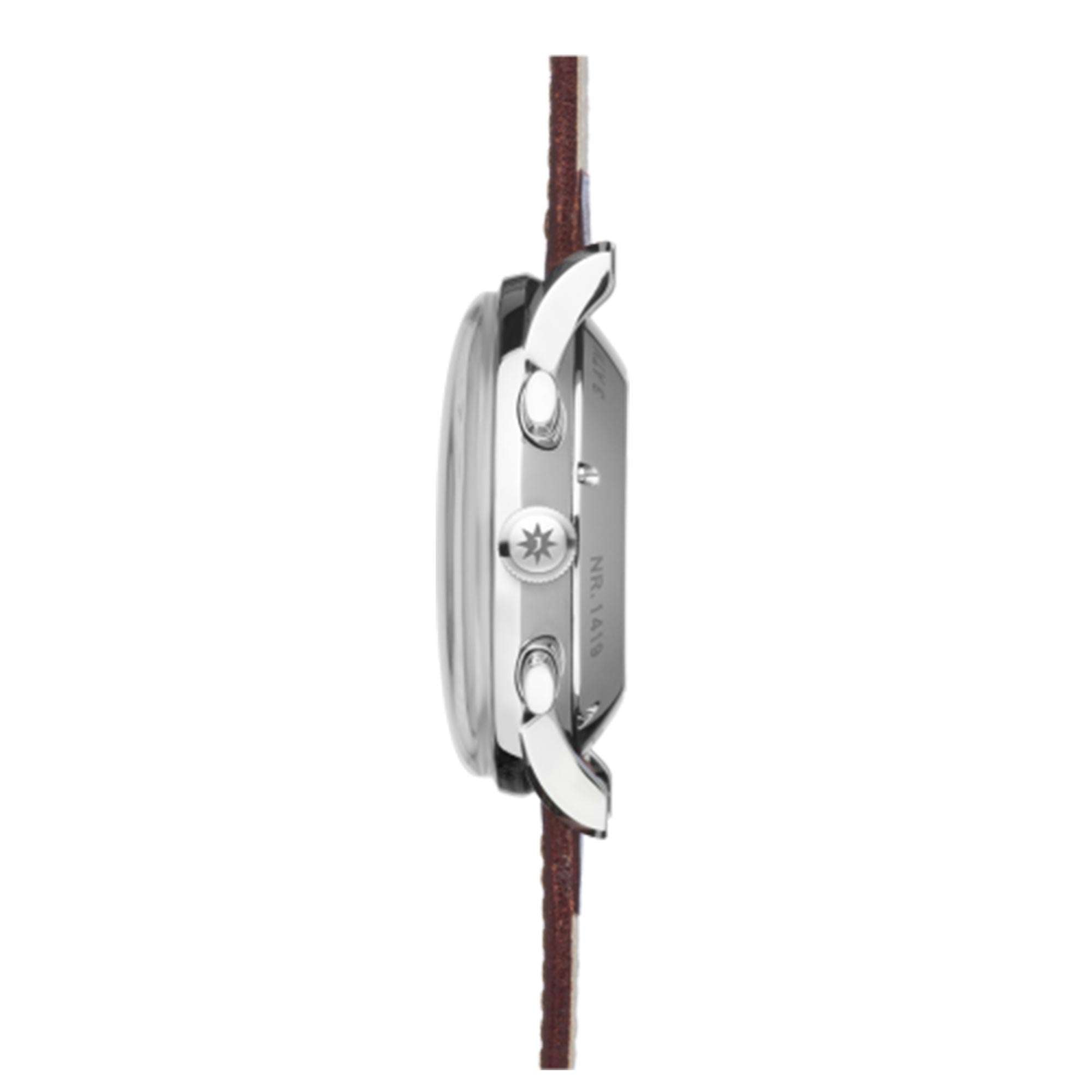 The silver dial is housed inside a silver stainless steel case. The crown, of which can be seen at the 3 o’clock position is used to adjust the time and date window. Guarding the crown are two buttons either side which are used to access the watches chronograph function. All in all, the case measures at a diameter of 40.7mm which complements the sleek height of just 13.9mm. Sat inline with the case is plexiglass which allows for both a clear view and a resistance to any potential knocks and bumps.