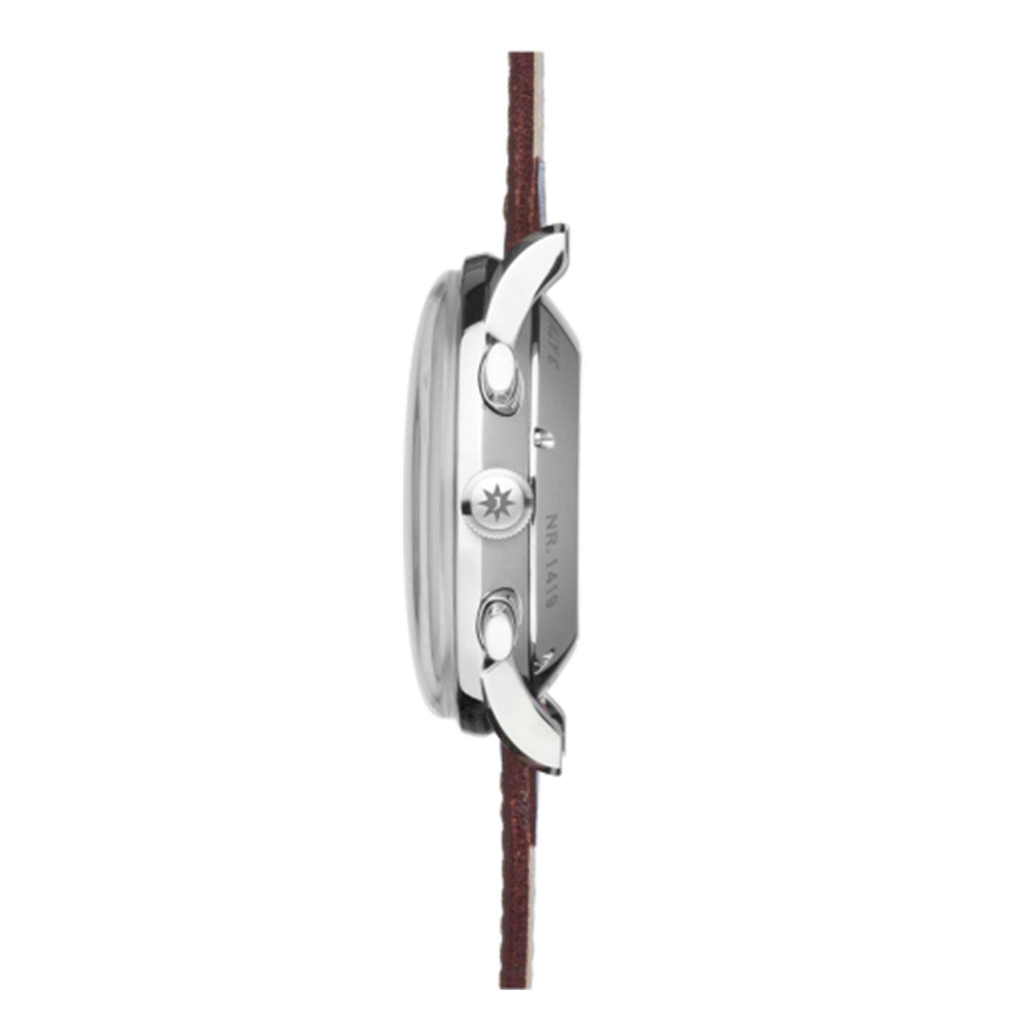 Encased in stainless steel and finished with a rich brown horse skin band the Junghans Meister Chronoscope 027/4120.01 is a magnificent timepiece. An expertly crafted mechanical watch with hand winding movement, and displays for day, date, and silver appliqués around the matte silver plated dial. Elegant or dynamic? A combination of th both with the Meister Chronoscope. After all, this watch effortlessly combines classic charm with sporty functions. What more could be wanted with a watch?