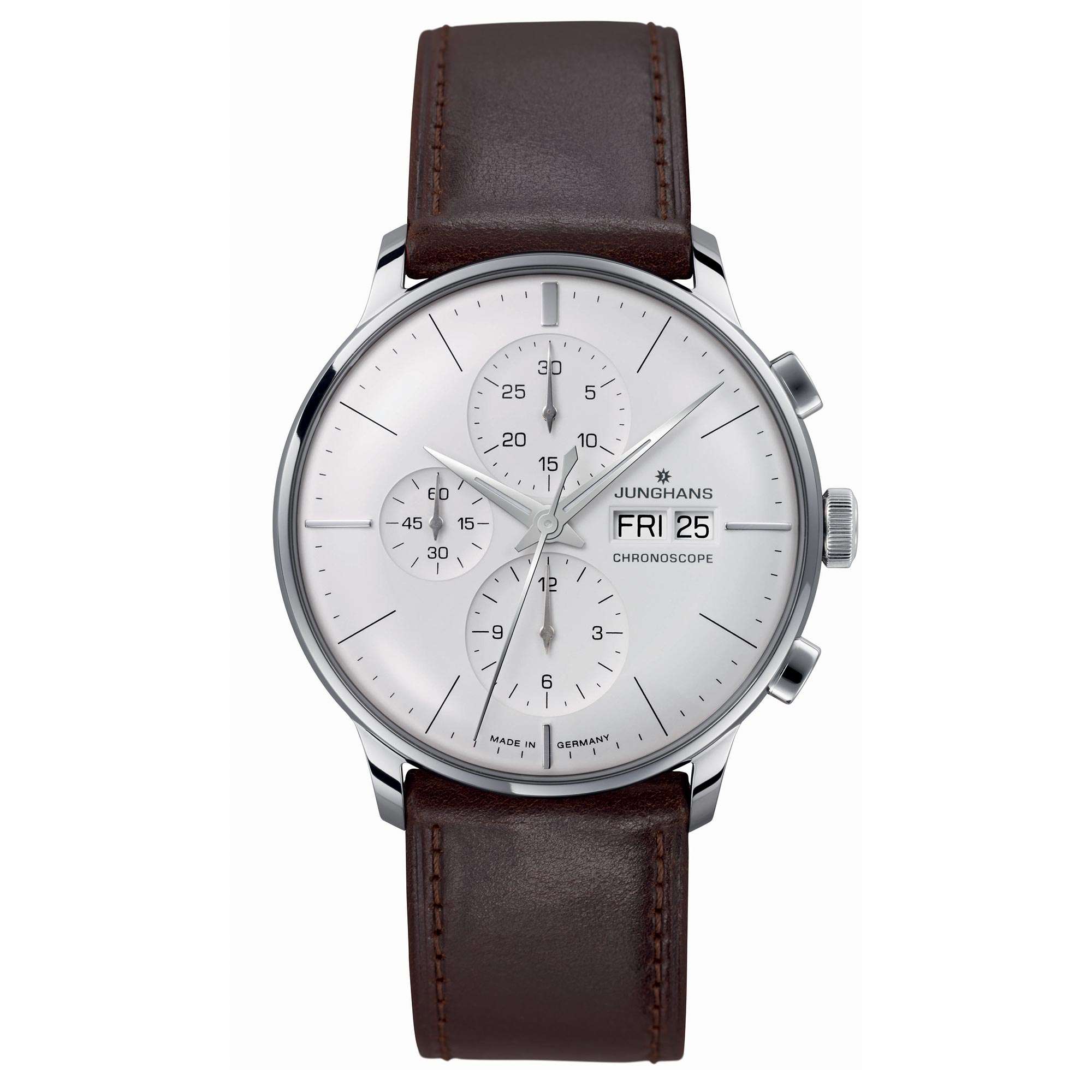 Junghans Meister Chronoscope 027/4120.01 Mechanical Hand Wind Silver Dial Leather Strap Mens Watch
